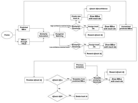 Following similarity computation, all detected bounding boxes are matched with predicted tracklets based on their corresponding similarity scores. The Hungarian algorithm is employed to perform the optimal matching operation, ensuring efficient tracklet-detection association. After the matching operation is conducted, both high-confidence and low-confidence matched tracks undergo similarity-based validation. For high-confidence matched tracks, if the matched similarities exceed a predefined threshold, bounding boxes are generated, tracks are updated with their corresponding matched detected bounding boxes, and their values are rewarded with an increment of . Conversely, when high-confidence detections fail the threshold criterion, new tracks are initialized using the threshold-failed high-detection bounding boxes, their respective detection confidence scores are assigned as initial values, and bounding boxes are subsequently drawn.