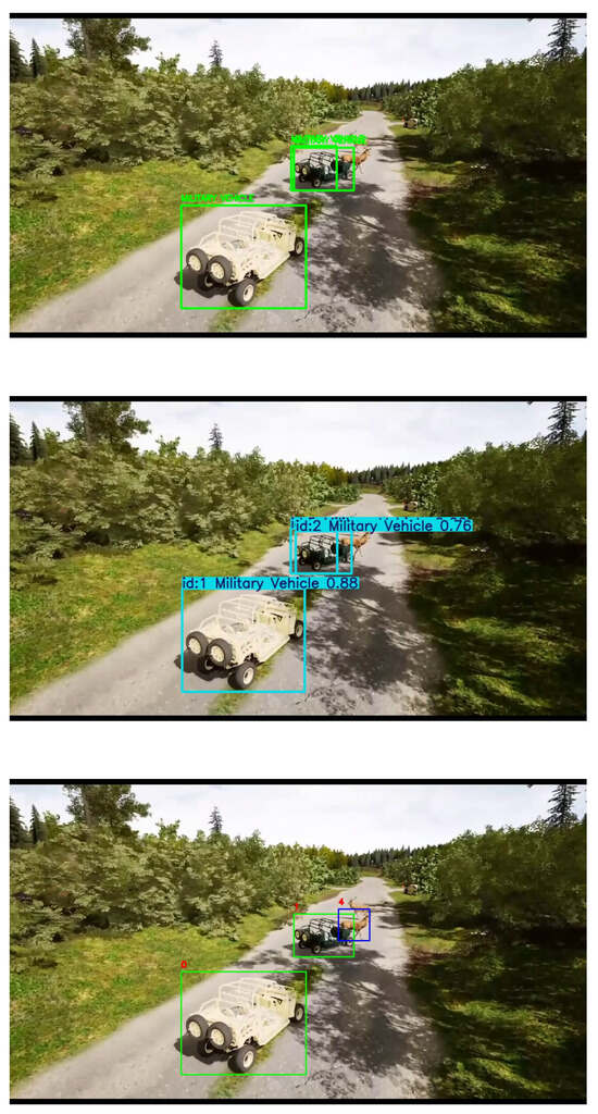 Table 3 presents a performance comparison of the three frameworks across different scenarios in the Unreal Engine test environment. Two sample videos from the test environment were selected, and a total of 784 images were manually evaluated for performance analysis. The results demonstrate that the proposed framework significantly enhances detection performance over the baseline YOLO model by reducing false negative cases. The reduction in false negative cases was 33.4% for the low-density scenario and 19.2% for the high-density scenario, resulting in a 15.8% and 11.2% increase in detection accuracy for both cases, respectively. Additionally, the proposed framework achieved MOTA scores of 66.4% and 41.1%, outperforming ByteTrack by 15.8% and 6.9% in the low-density and high-density scenarios, respectively.