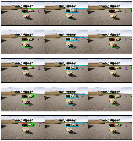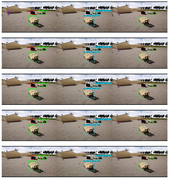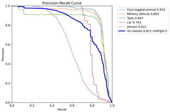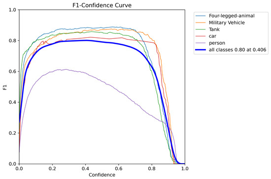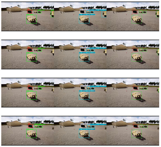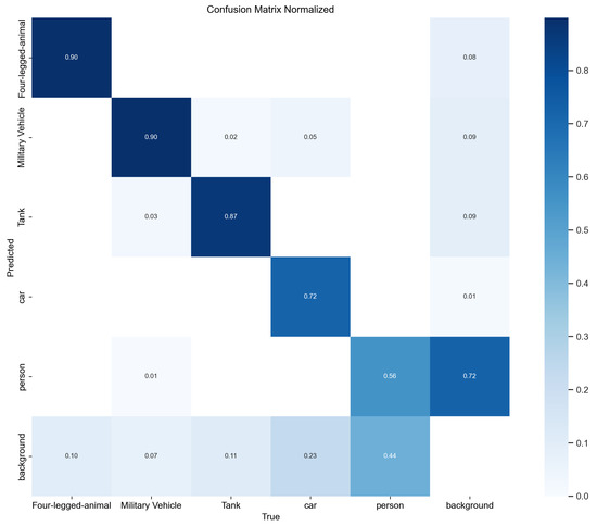 First, we tested our detection enhancement algorithm on a model trained on the custom Unreal Engine scenario. A dataset of 7898 images, including 3004 open-source images from the Roboflow community captured under diverse dynamic lighting conditions and 212 simulated images generated in Unreal Engine, were used to train the YOLO model using five classes: Human, Four-legged animals, Car, Military Vehicles, and Tank. Only deer are included in the “Four-legged animal” class, and the “Military vehicles” class encompasses military trucks, armored personnel carriers (APC), and armored cars. Examples from the training dataset are shown in Figure 6. The ‘Adam’ optimizer was used to train the model with a learning rate of 0.001111 and momentum of 0.9 for 120 epochs. Figure 7 shows the Precision–Recall curve and Figure 8 shows the F1 curve for all classes. The lack of precision and recall—attributable to the limited size of the dataset—resulted in missed detections in several frames due to low confidence, particularly for smaller objects with lower confidence scores. This is evident in Figure 9, where a significant portion of each class objects are misclassified as “background” (i.e., not detected), with the “Person” class exhibiting the highest rate of missed detection due to its smaller size in a frame. In total, 29% of the objects in the test dataset were rejected due to misclassification as background. Upon closer observation, it was found that “Person” objects located farther from the camera were more frequently misclassified due to their smaller image footprint and limited discriminative features. The reduced scale of these distant objects makes it challenging for the model to extract meaningful spatial cues, leading to a higher false-negative rate. A potential approach to mitigate this limitation involves incorporating scale-aware detection strategies or leveraging depth cues to enhance spatial representation such as multimodal fusion for object detection [36,37] or utilizing RGB-D camera data for model training [38] to impart depth information, which increases model complexity and data dimensionality. PrED is designed to alleviate this issue within the RGB domain, as demonstrated in the following sections.