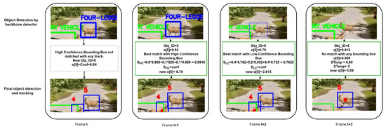 Figure 11 illustrates a scenario in which two similar objects (four-legged animals/deer) are in close proximity. The YOLO backbone successfully detects the deer further from the vehicles in frame 1 and 2 but loses its detection in subsequent frames. For PrED, these two detections raise the value of the object high enough that it maintains tracking the deer (track 5) in subsequent frames. Meanwhile, the deer close to the vehicles (track 4) are being predicted without any bounding box based on its high (bounding box with red dot). Despite that, no switch in tracking ID was observed. As the value for track 4 decays, its bounding box prediction ceases in frame 5 but reappears in frame 6 with the same tracking ID due to the availability of a low-confidence bounding box. Notably, ByteTrack fails to detect either of the two objects over the six frames.