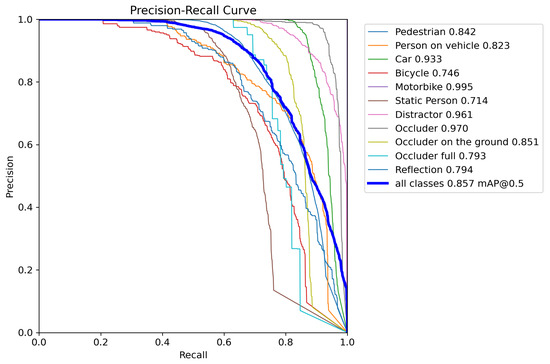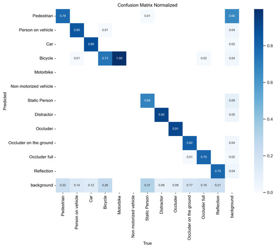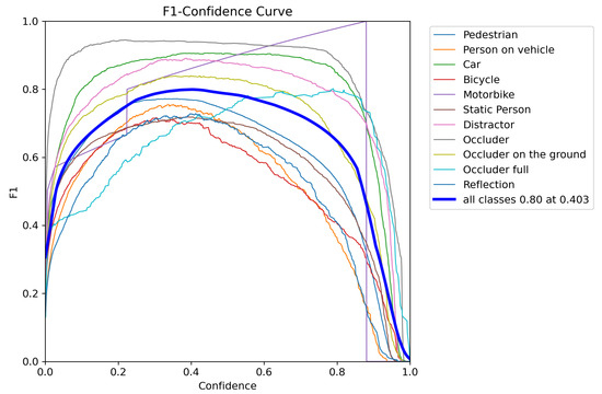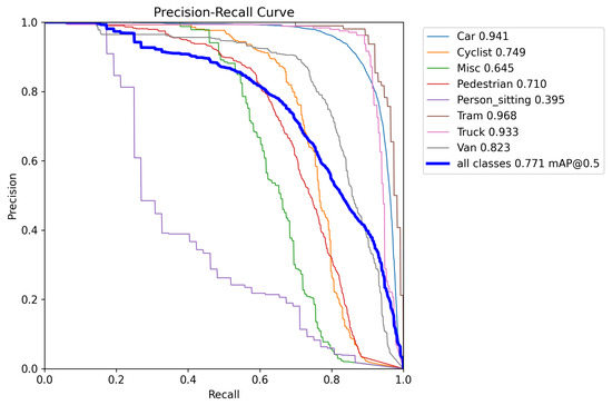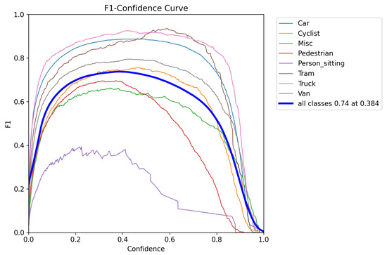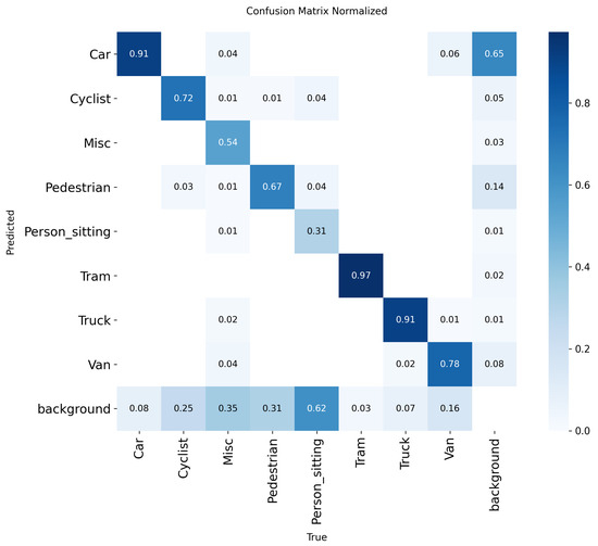 To evaluate PrED’s performance on a benchmark driving scenario dataset, we trained a model using the KITTI dataset processed by Sebastian Krauss [39]. The KITTI training dataset contains 7464 images captured under a wide range of shadow patterns and lighting conditions under dry weather, providing natural variability for model evaluation. Four 1.4 Megapixel Point Grey Flea 2 cameras were used to capture RGB and greyscale videos at 10 FPS. The images were later cropped to 1382 × 512 pixels to generate the dataset. To simulate suboptimal detection performance, we employed the Adam optimizer with a learning rate of 0.000833 and momentum of 0.9 for 50 epochs. The resulting model’s performance characteristics are illustrated in Figure 15 (Precision–Recall curve), Figure 16 (F1 curve), and Figure 17 (normalized confusion matrix). The confusion matrix reveals significant detection deficiencies: even at the default confidence threshold of 0.25, the model misclassifies 25% of ‘cyclist’ objects, 31% of ‘pedestrian’ objects, 62% of ‘person sitting’ objects, and 16% of ‘van’ objects as background, demonstrating the substantial room for improvement that PrED aims to address.