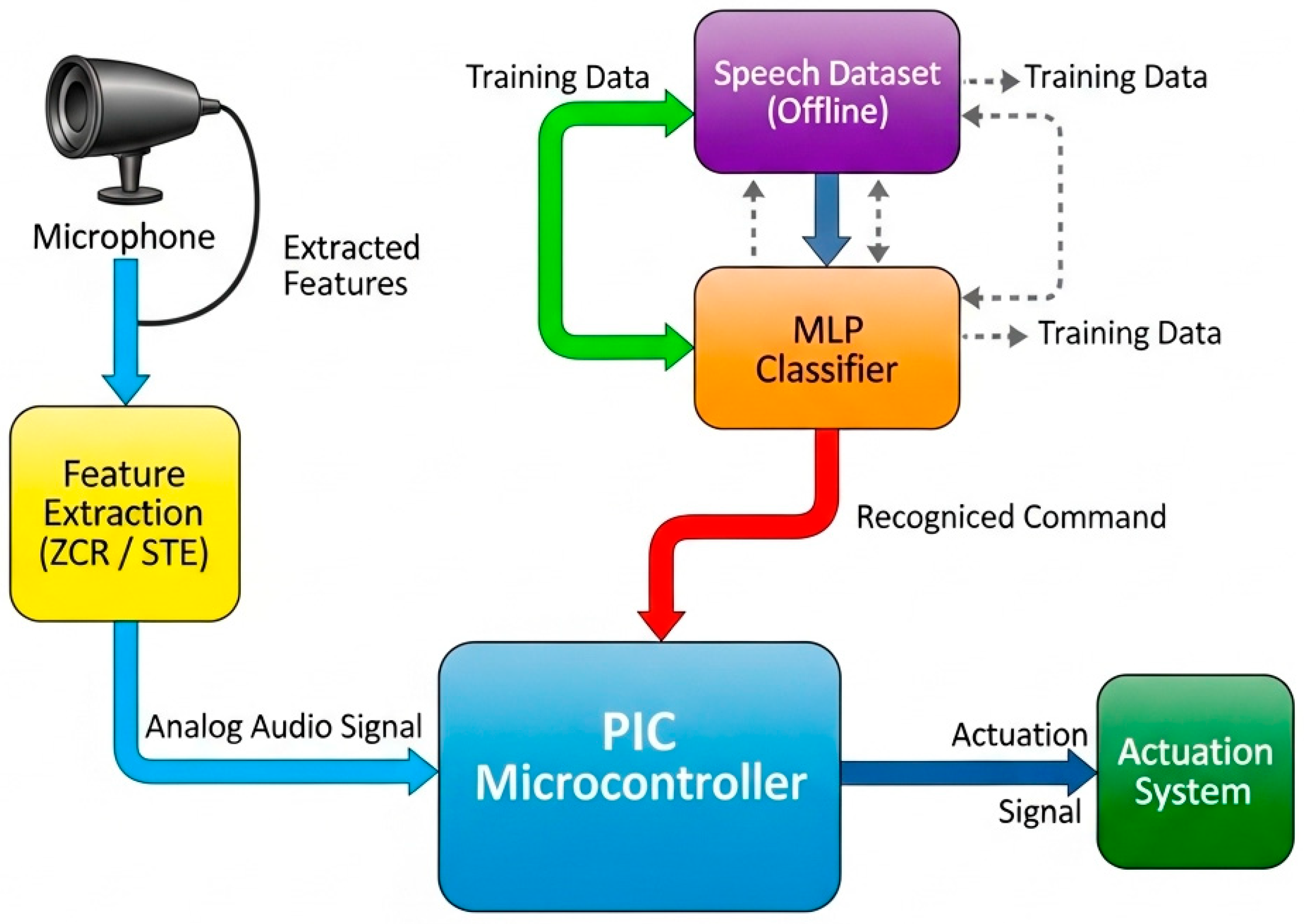 During offline training, a small quantized Multi-Layer Perceptron (MLP) is trained using a dataset of labeled voice commands. While common feature extraction techniques such as MFCC, LPC, and FFT are widely used in the literature, they were not employed in this work due to their high computational demand. Instead, the system relies on Zero-Crossing Rate (ZCR) and Short-Time Energy (STE), lightweight features that enable real-time execution on resource-constrained devices such as the PIC microcontroller.