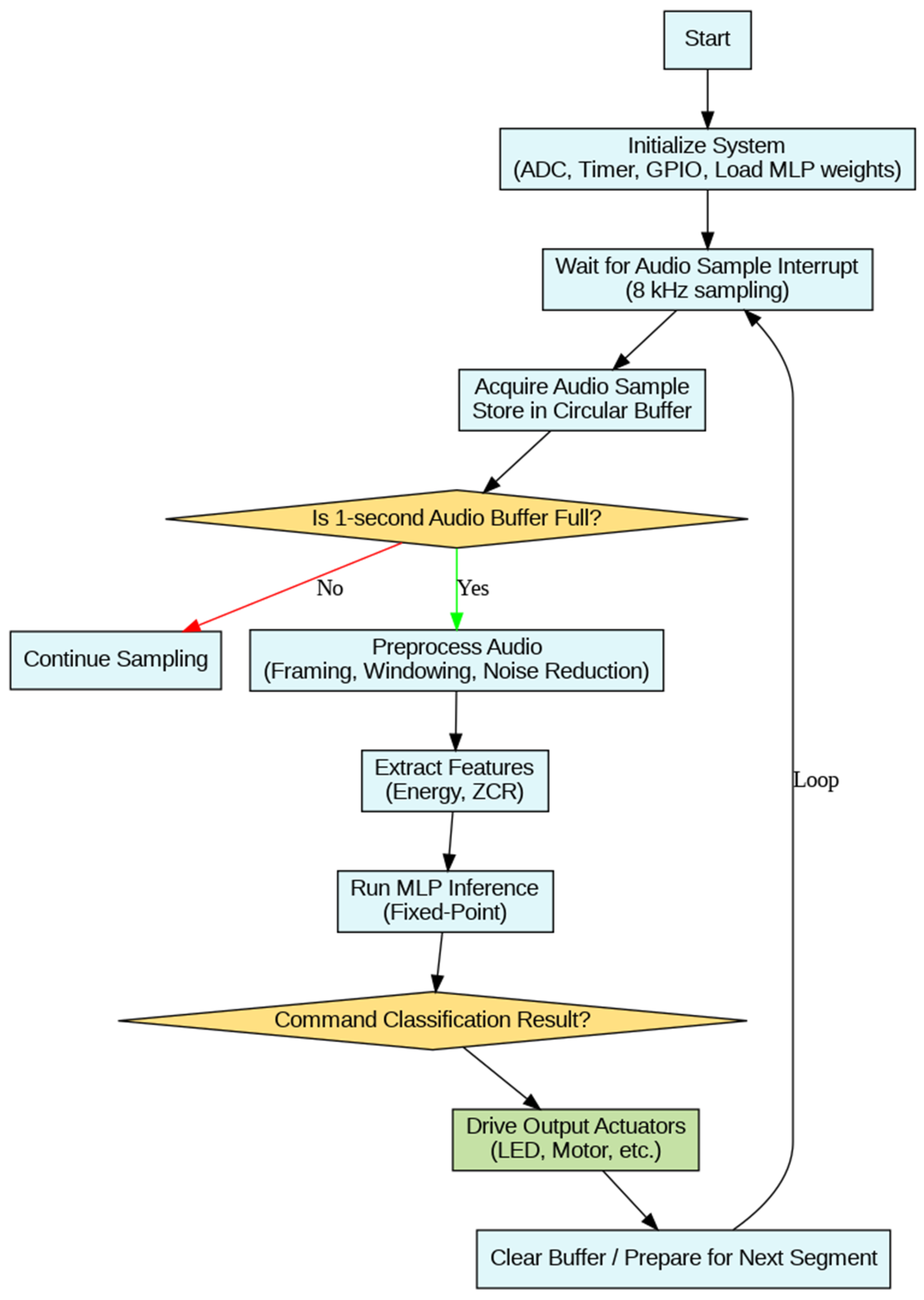 Figure 3 and is executed on a continuous real-time loop. After setting the components (ADC, timer, GPIO, MLP weights up), the MCU samples one second of audio, preprocesses the signal and extracts features. These features are categorized by the quantized MLP, which activates the control signals to the actuators. A loop returns the system to sample more.