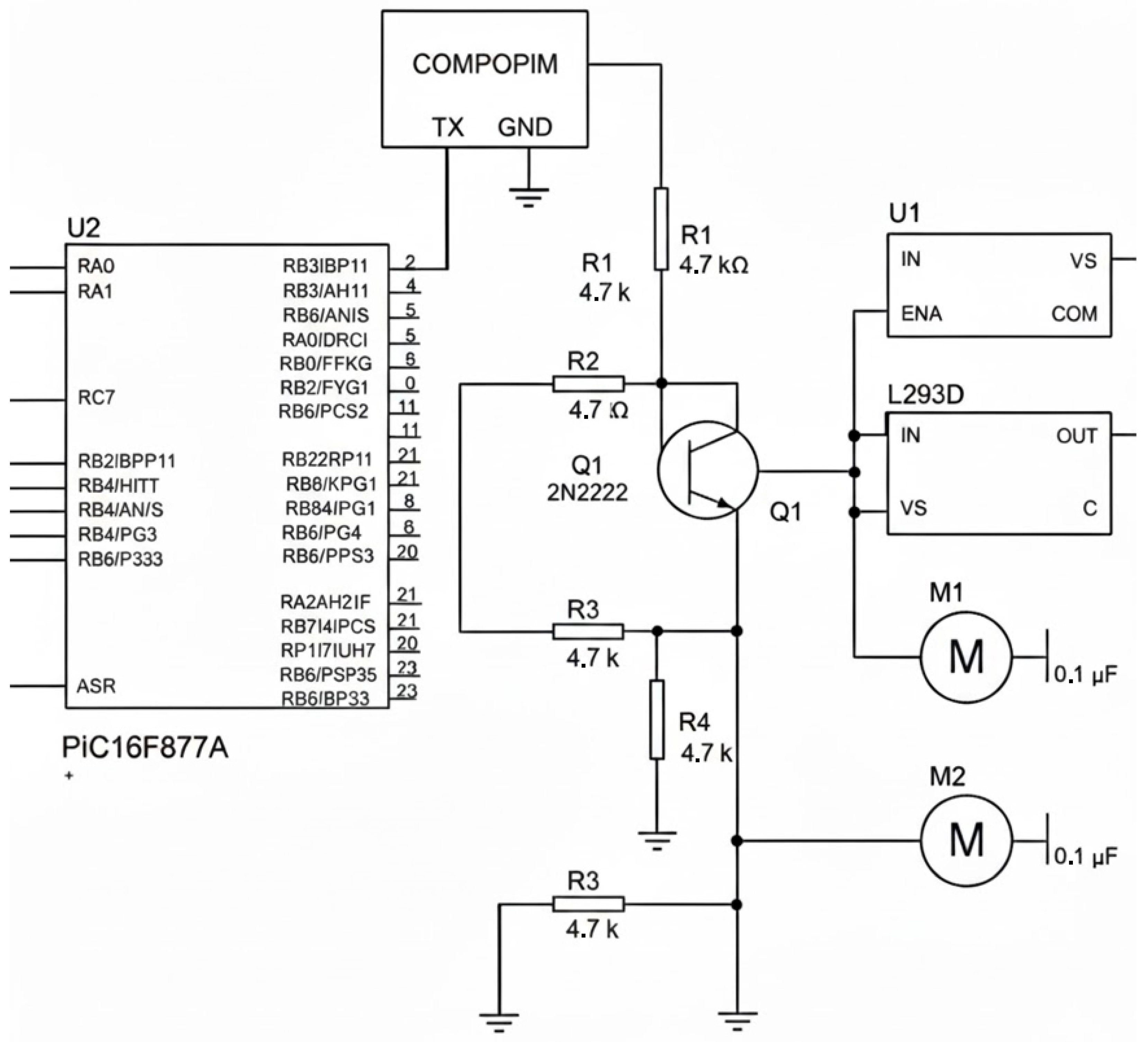 Table 5 shows the matching of voice commands to motor actions. The PIC16F877A microcontroller takes a voice command and generates the appropriate signals on PORTD, which drives the L293D driver in order to energize the motors. For instance, the voice command of “ON” would energize both motors to go forward. The voice commands of “LEFT” and “RIGHT” will rotate the system in different direction.