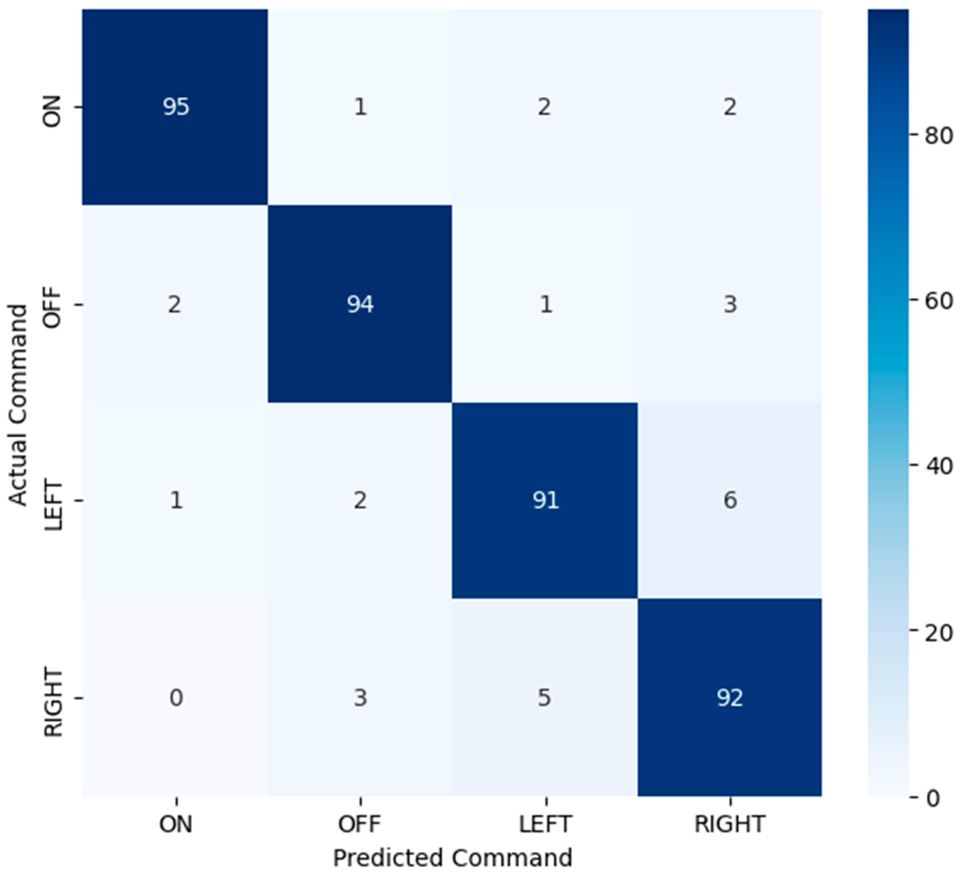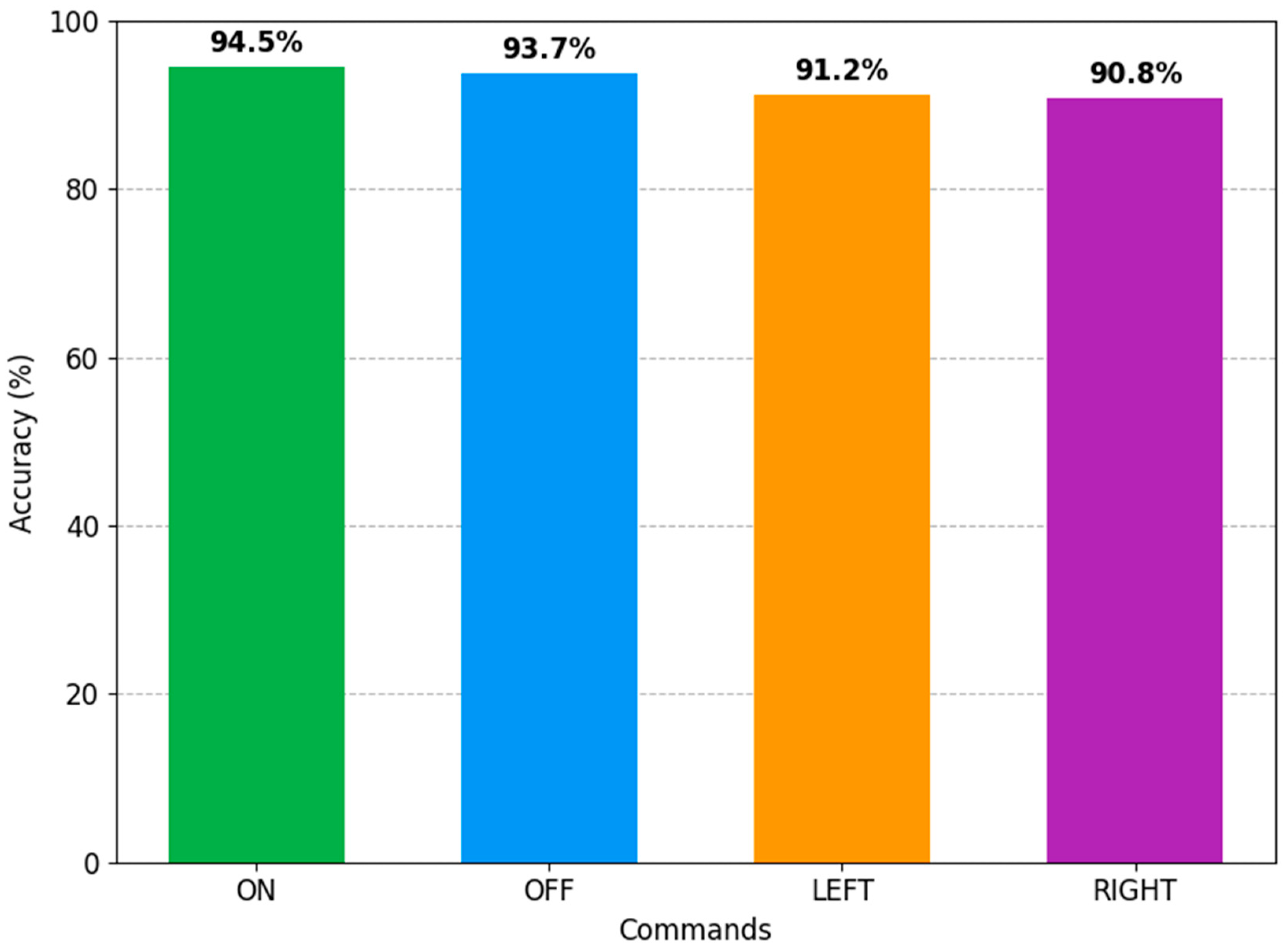 To provide a more comprehensive evaluation of the voice command recognition system, we calculated precision, recall, and F1-score for each of the four commands (“ON”, “OFF”, “LEFT”, and “RIGHT”). These metrics complement the accuracy and confusion matrix by quantifying the model’s ability to correctly identify each command while accounting for false positives and false negatives.
