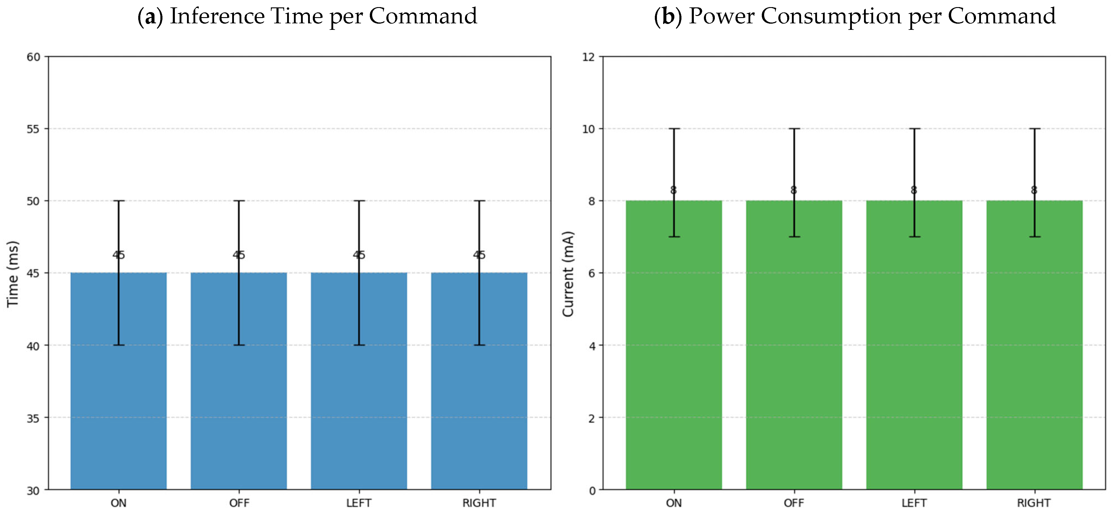 Figure 7b presents the corresponding power consumption in milliamperes for each command. Displaying the data in two separate subplots clearly differentiates computational latency from energy usage, providing an accurate and standardized representation of the system’s performance for real-time embedded applications.