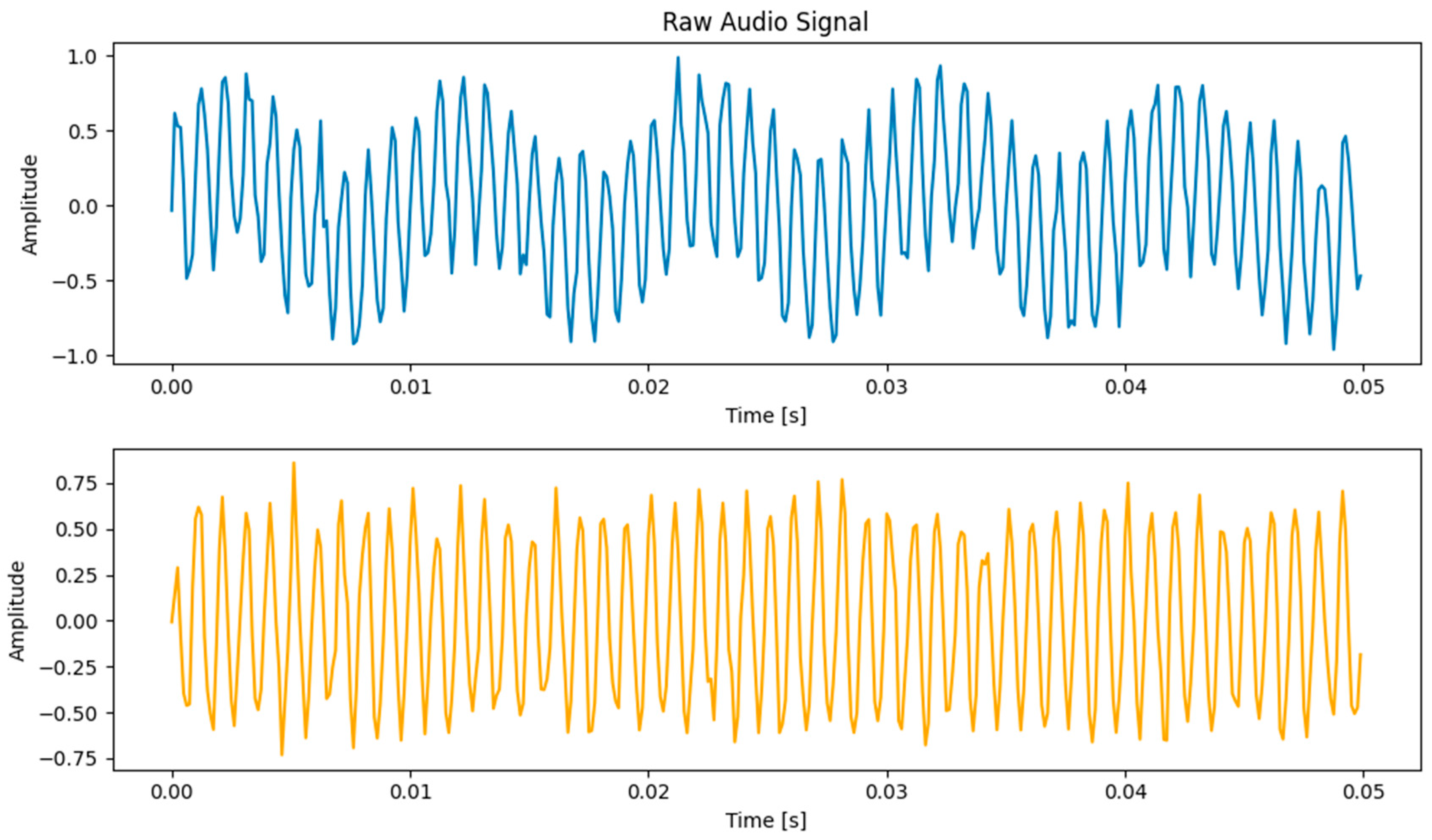 Figure 8 shows sample audio waveforms of the spoken command “LEFT”. The top figure displays the raw unfiltered audio signal, which includes background noise, while the bottom figure shows the signal after band-pass filtering. Filtering effectively reduces background noise, resulting in a clearer speech component and improved recognition performance.