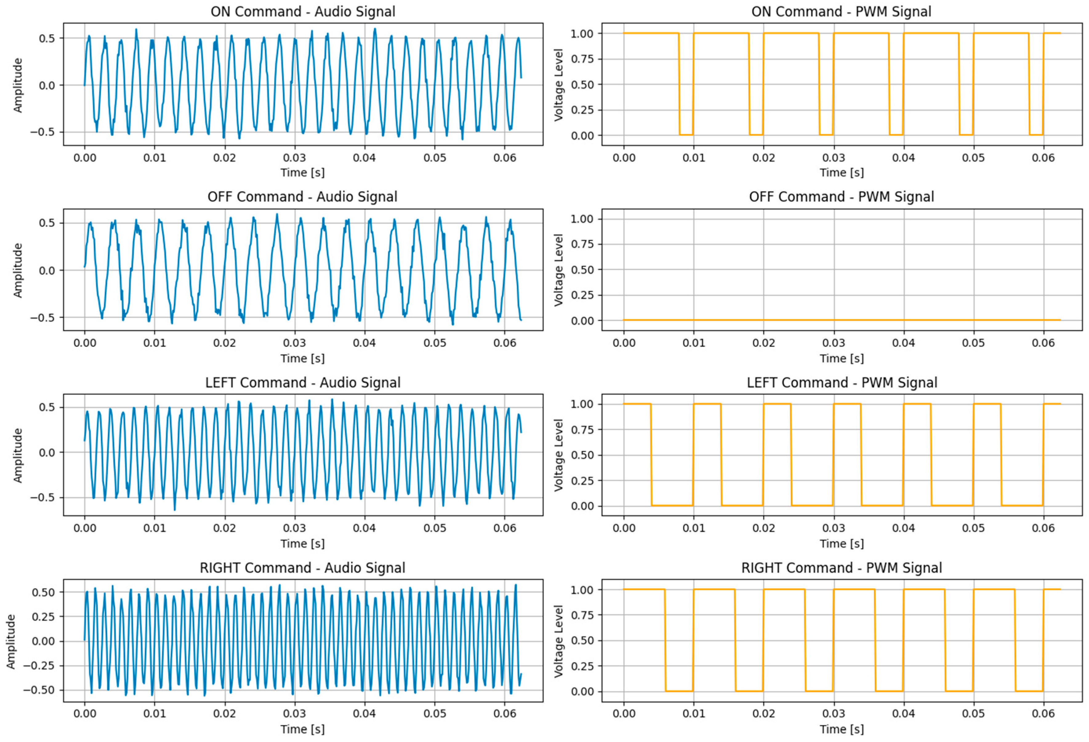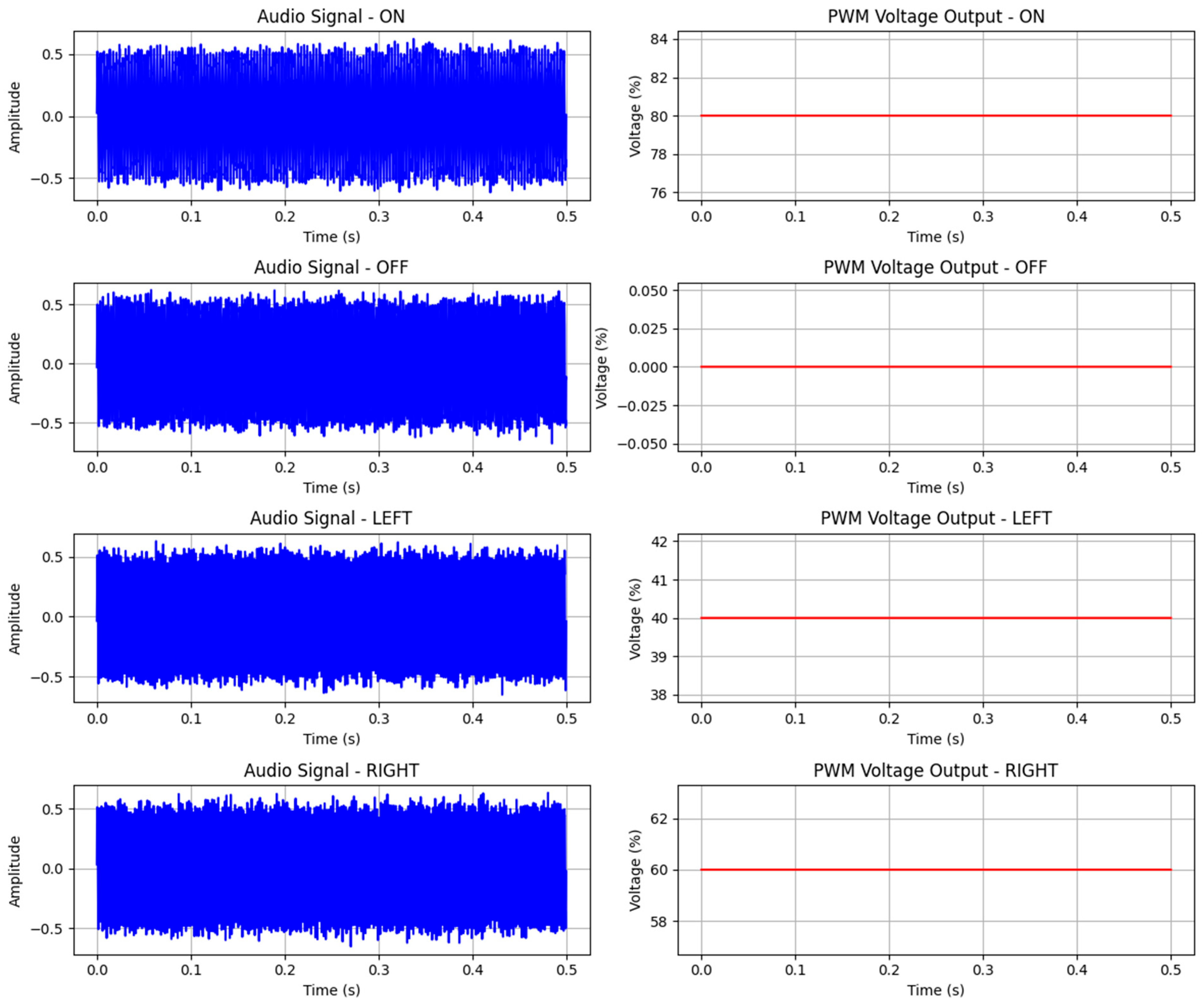 Figure 9 shows the raw and filtered audio data that provided voice command signals for voice command recognition, as well as the PWM voltage control signals for the voice commands “ON,” “OFF,” “LEFT,” and “RIGHT.” This figure shows the pre-processing and real-time control signals from the embedded system.