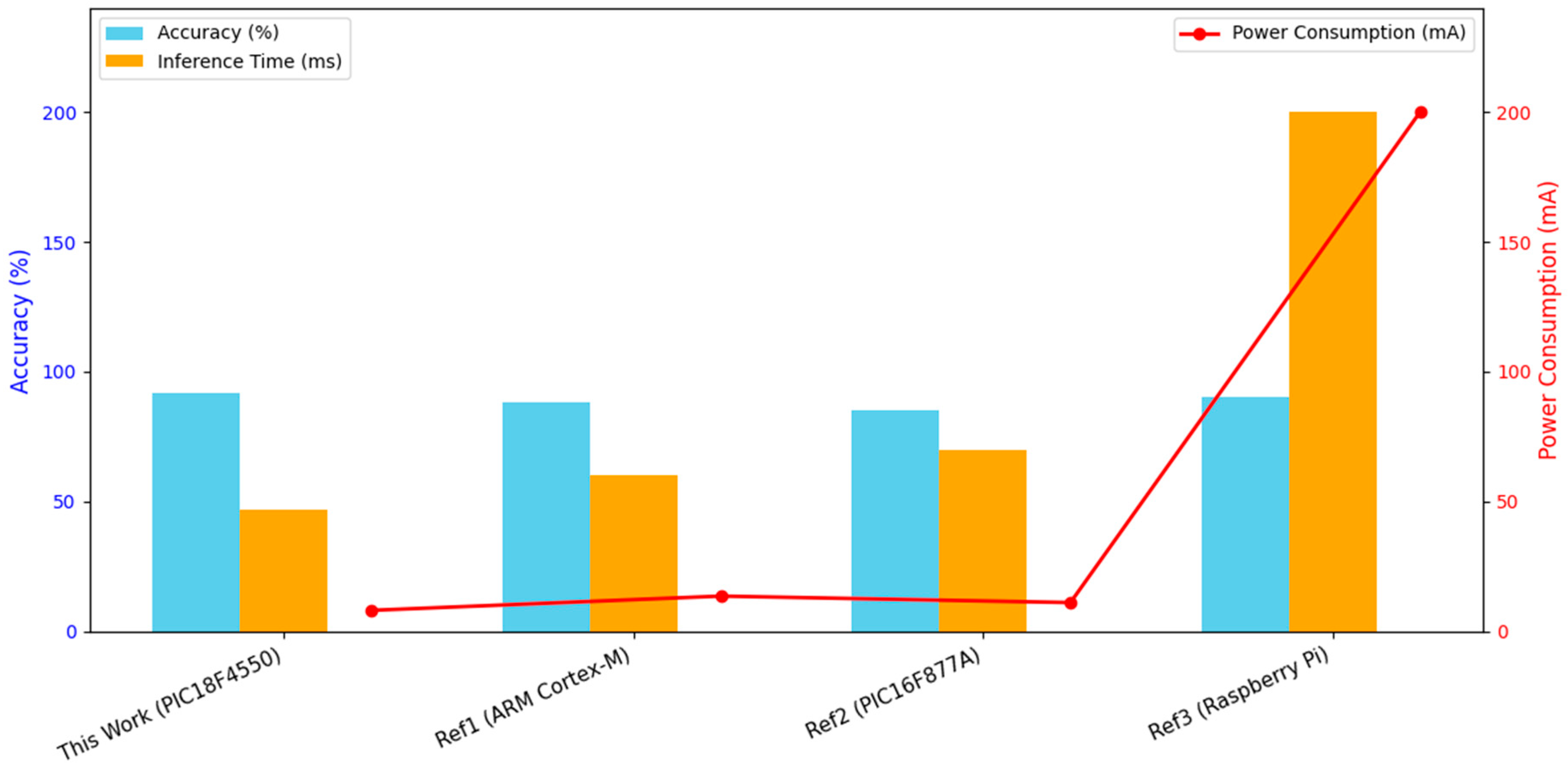 Additionally, the fixed-point implementation of the neural network further reduces energy consumption by avoiding floating-point operations, which are more demanding in embedded systems. The results demonstrate that the proposed system achieves a significantly lower power consumption (~8 mA) compared with ARM Cortex-M (12–15 mA) and Raspberry Pi-based systems (>200 mA), confirming the suitability of the design for low-power, real-time embedded applications.