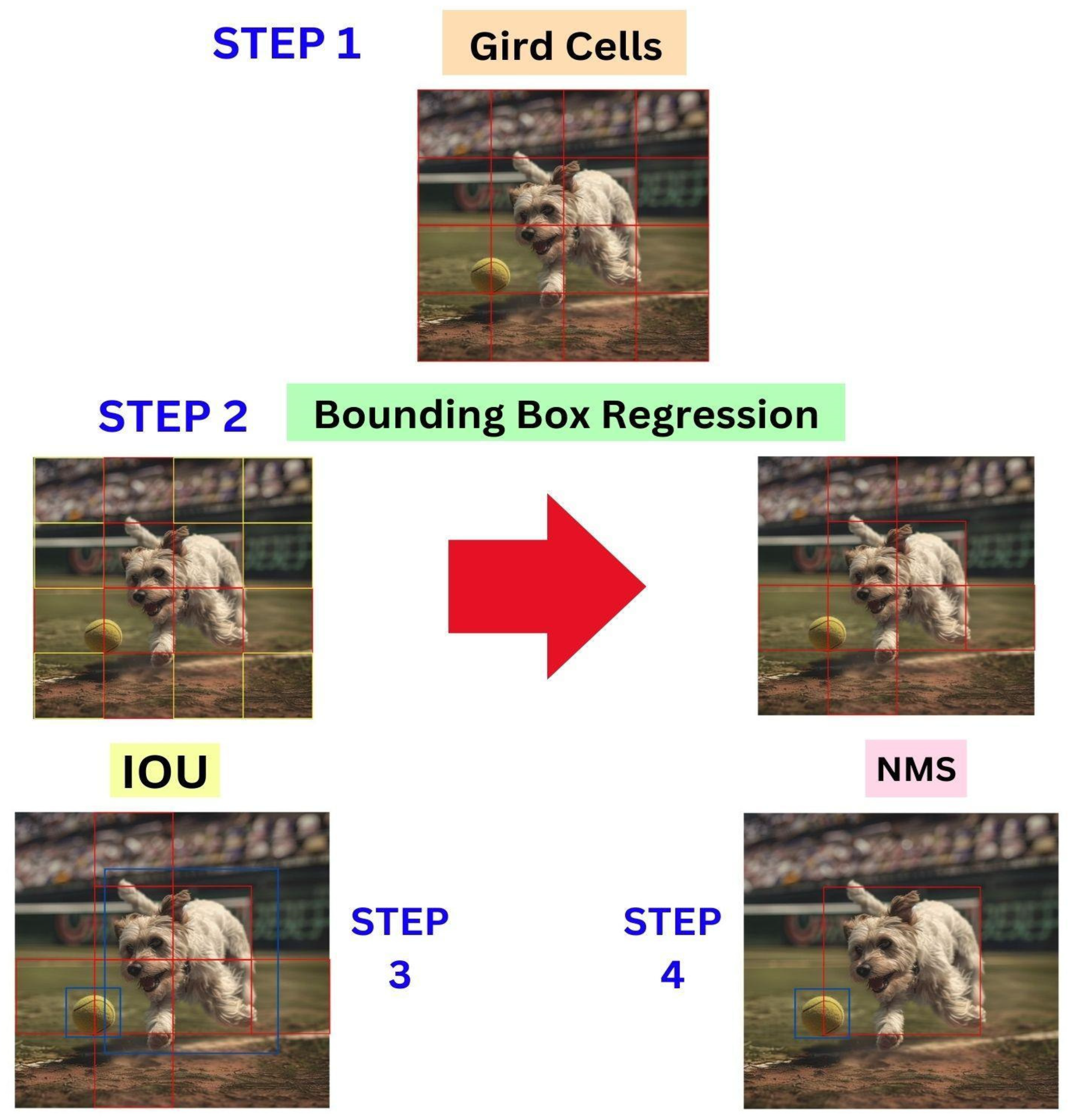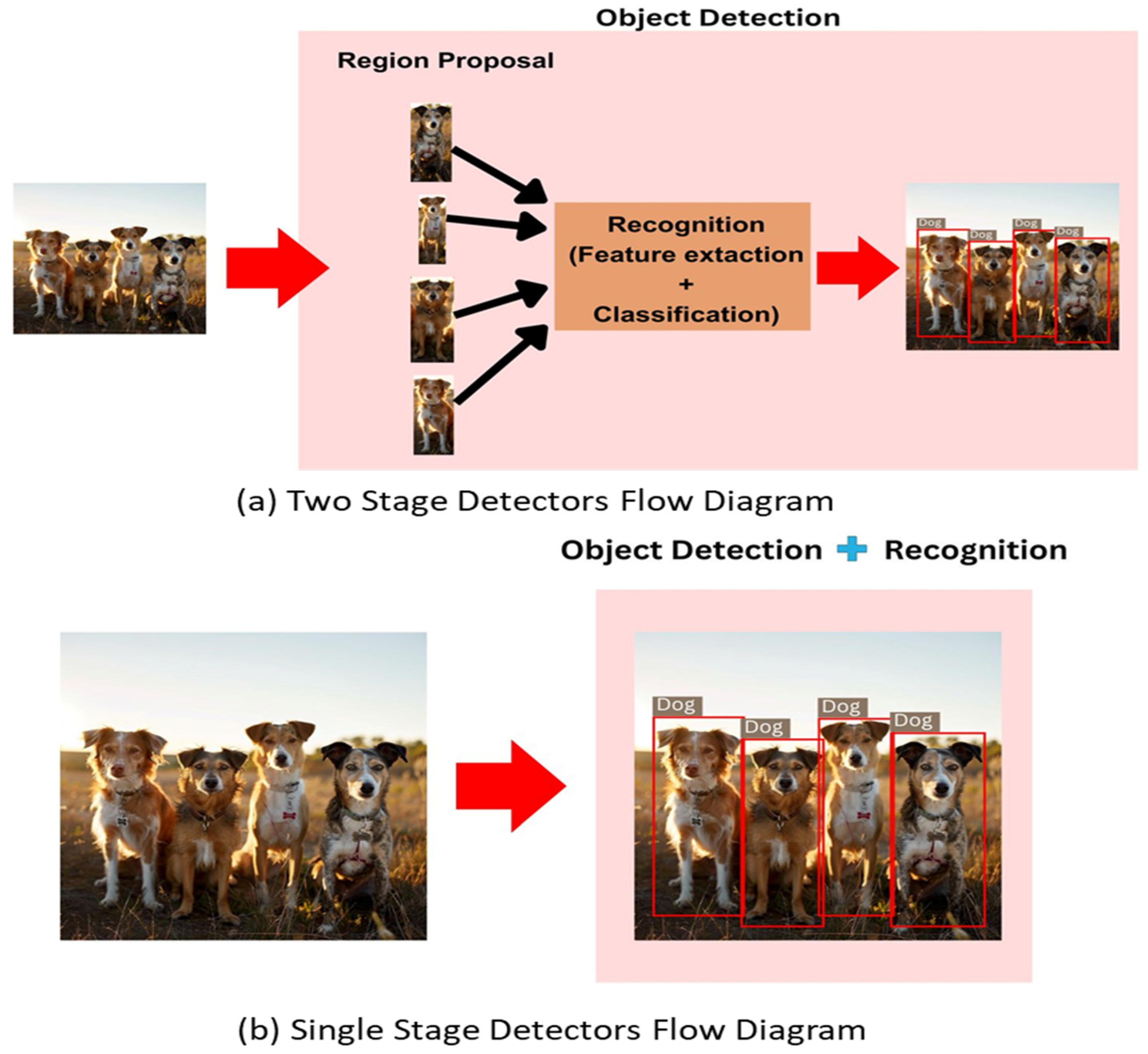 | Detection Process | Two-step process: region proposal generation, followed by object detection and classification. | Single-step process: Directly predicts bounding boxes and class scores from input. |