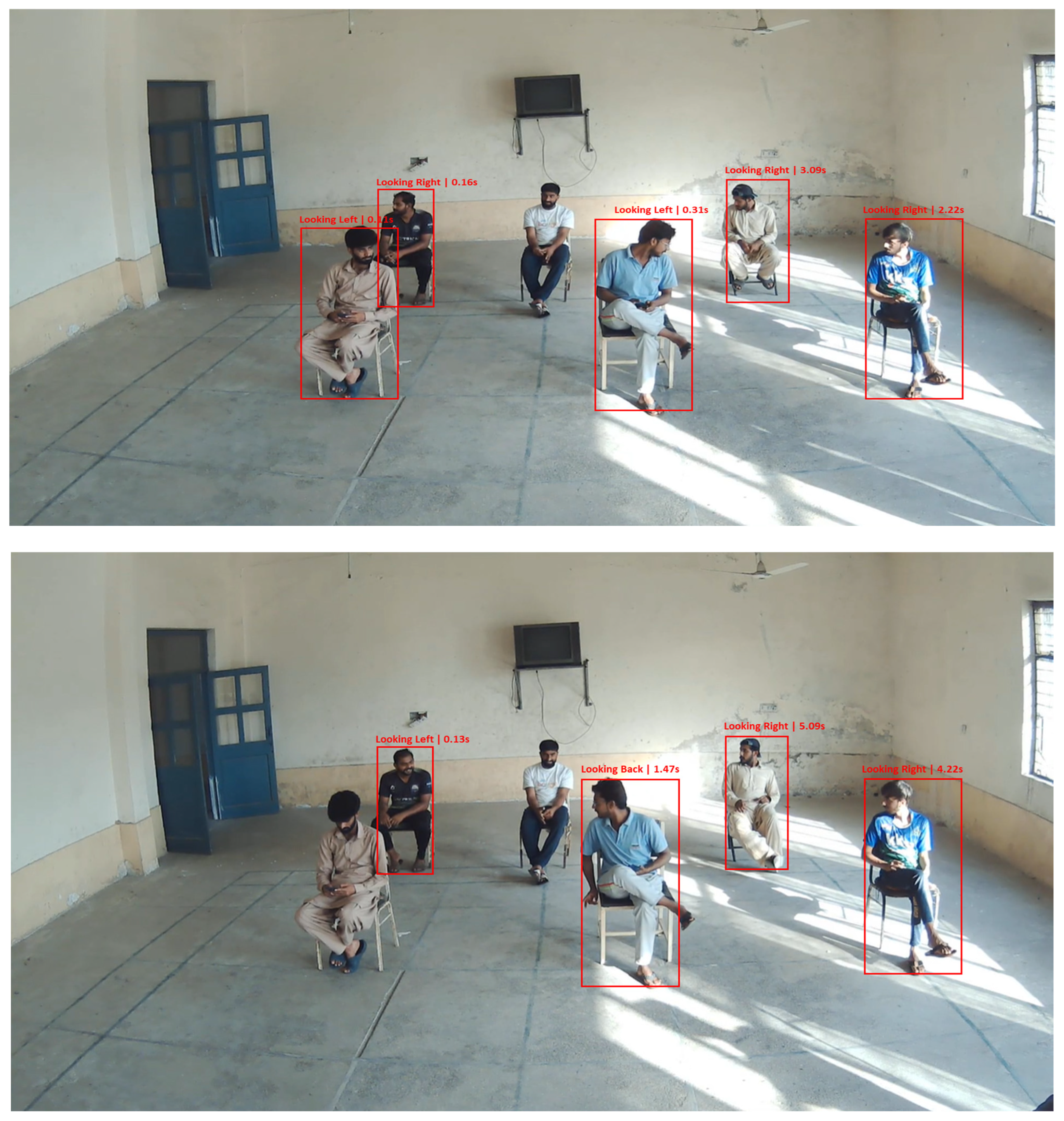 | YOLOv4 for Object Detection [36] | 2023 | Requires GPU for real-time detection | 95% | Detects specific cheating behaviors and objects (e.g., phones) during exams. |