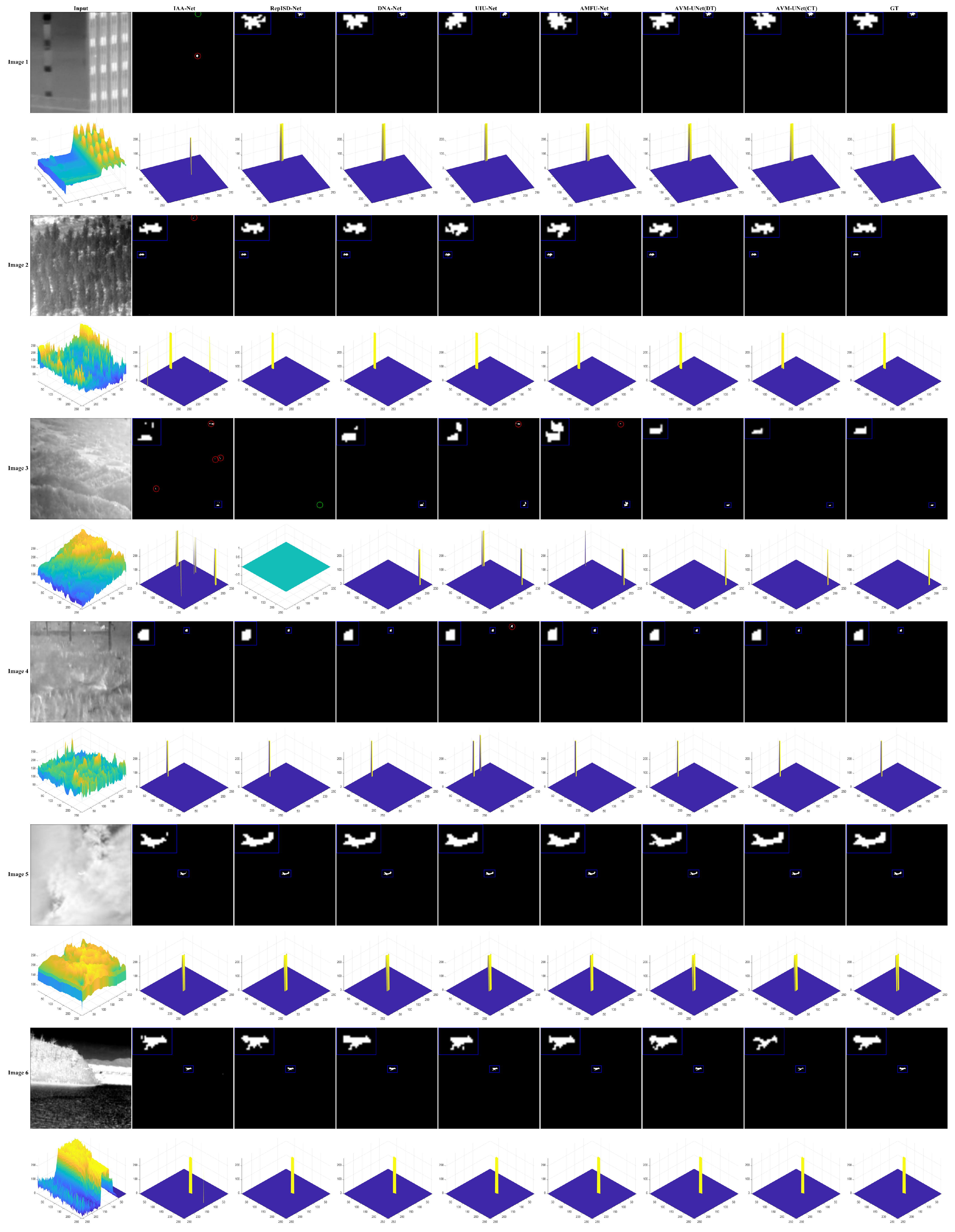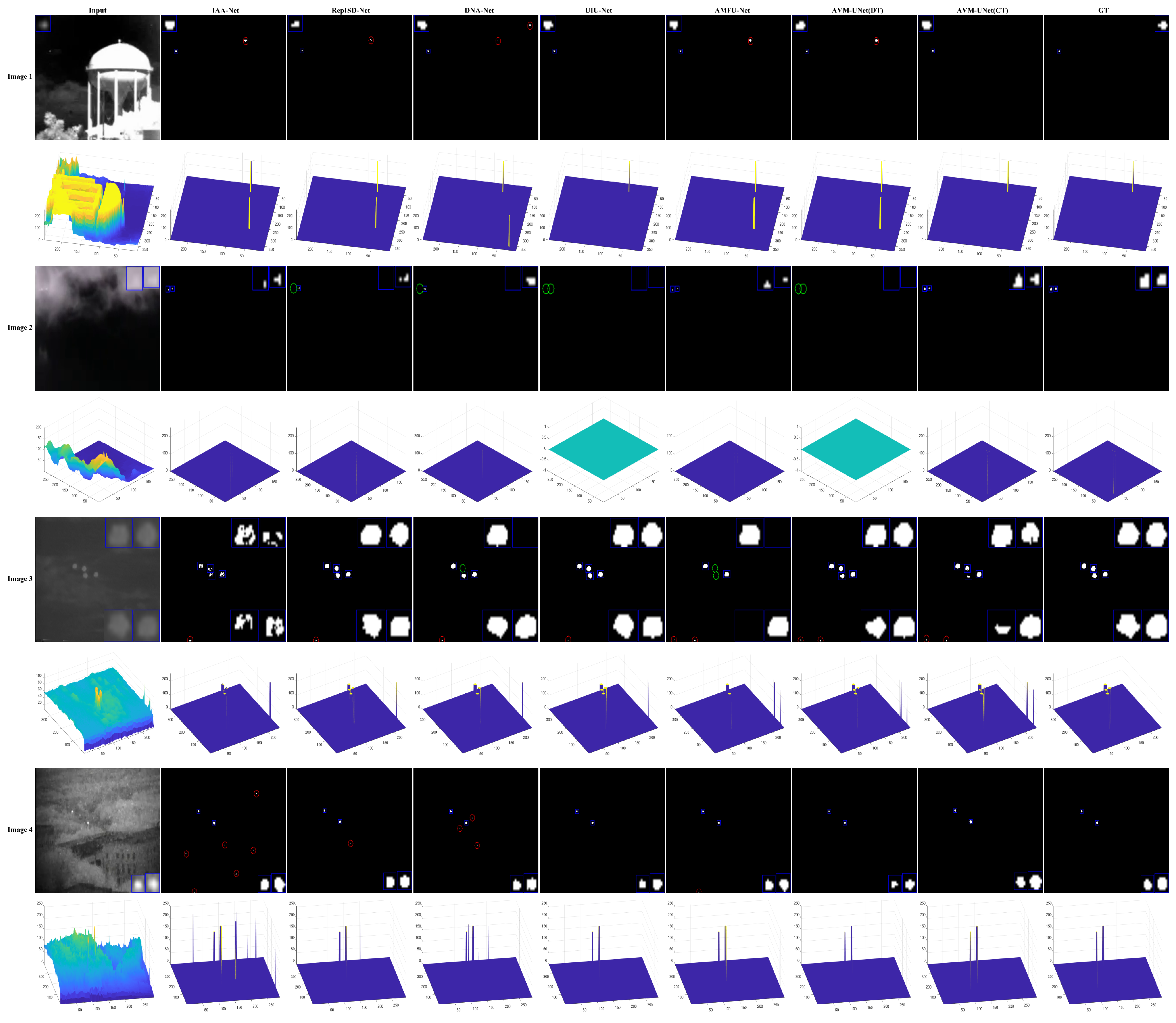 | IAA-Net | RepISD-Net | DNA-Net(Res18) | UIU-Net | AMFU-Net | AVM-UNet(DT) | AVM-UNet(CT) | ||