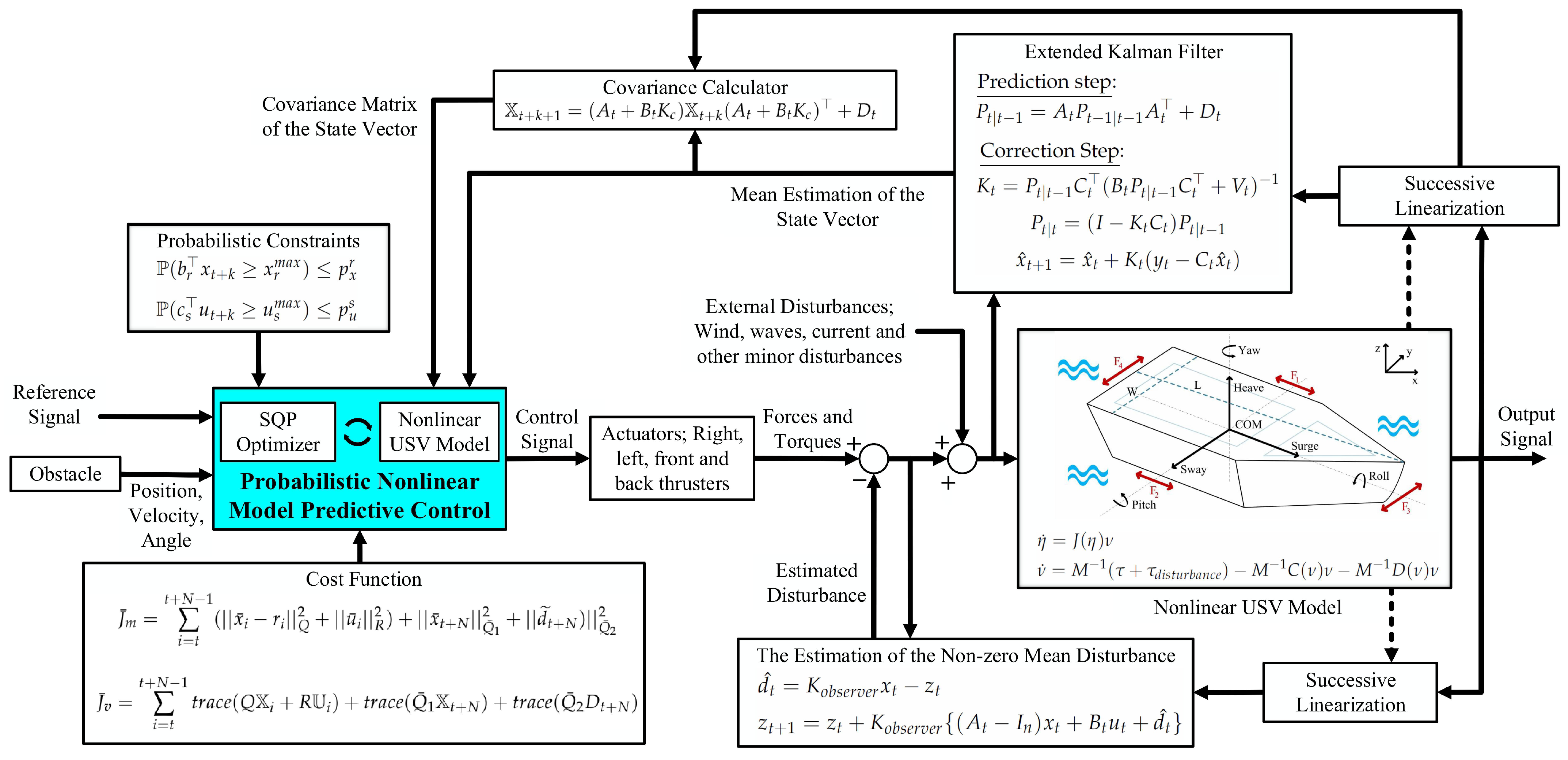 As stated above, we propose an extension of linear probabilistic MPC for nonlinear systems that enables it to work at all operating points and also operate under the effect of non-zero-mean probabilistic disturbances implemented on uncrewed surface vehicles, considering stationary and moving obstacle avoidance. Note that when a probabilistic disturbance with constant mean and variance is applied to a linear system, the states and outputs exhibit probabilistic signals with altered mean and variance, but these values remain the same at every operating point. However, when applied to a nonlinear system, the mean and variance of the probabilistic signals in the states and outputs change across different operating points. As a result, probabilistic linear MPC cannot be directly applied to nonlinear systems. To overcome this issue, we propose an extended Kalman filter (EKF) to estimate the mean value of the states along all operation points. Afterward, we propose utilizing this mean value in a dynamic equation that exists in probabilistic linear MPC with successive linearization (linearization at every sampling instance) to calculate the covariance matrix at every sampling instance or every state (operating point). With this information, the cost function and probabilistic constraints are updated at every sampling instance.