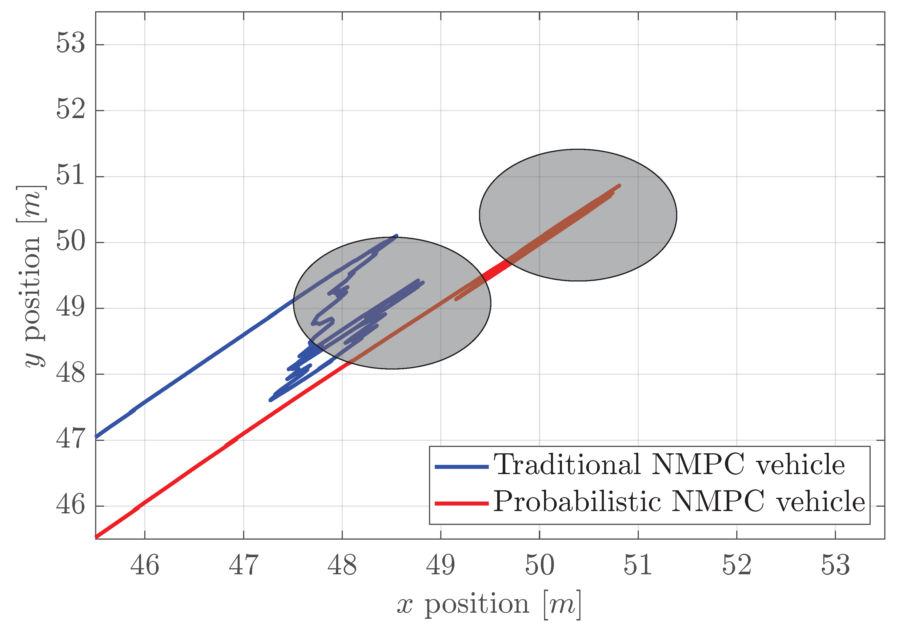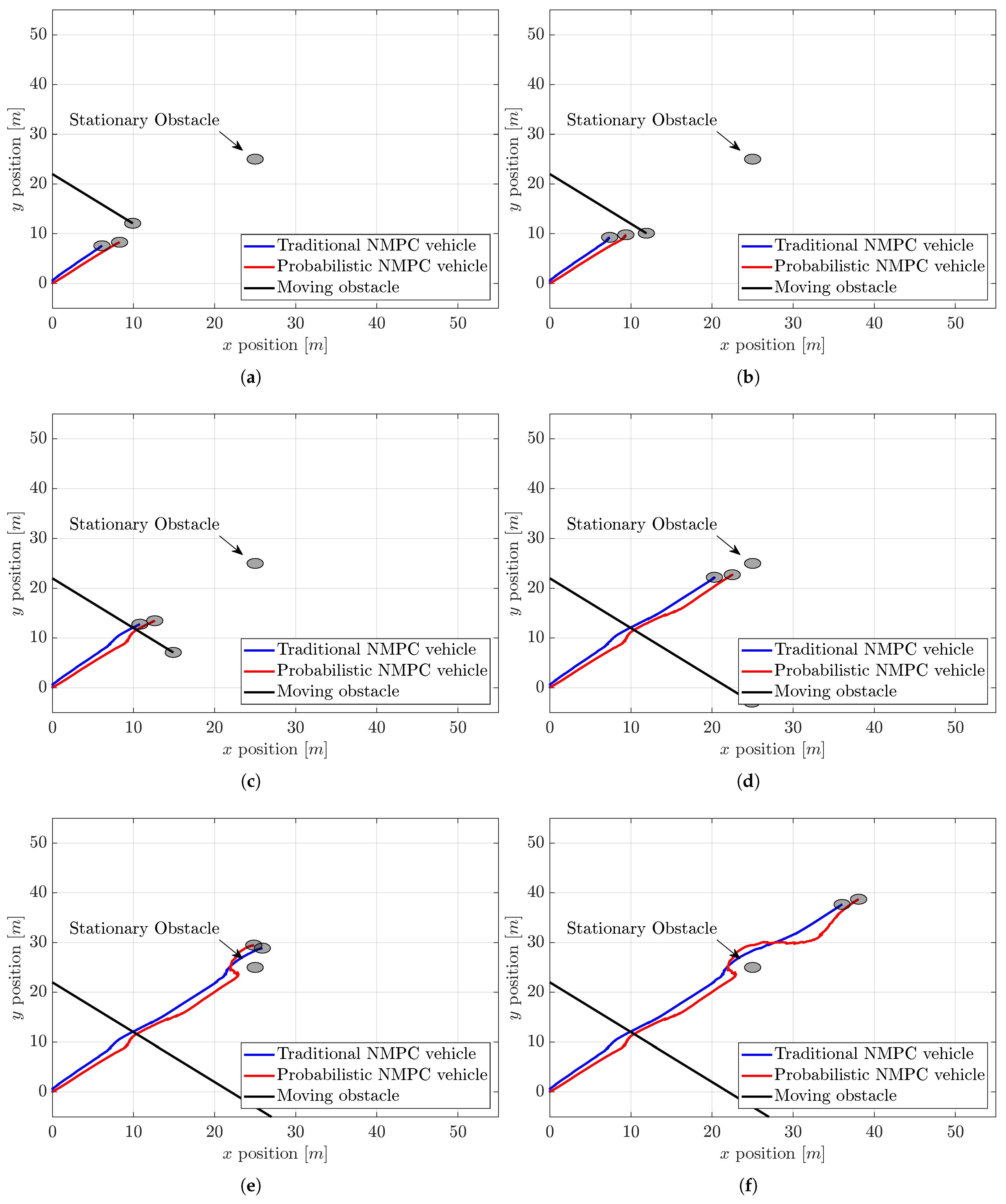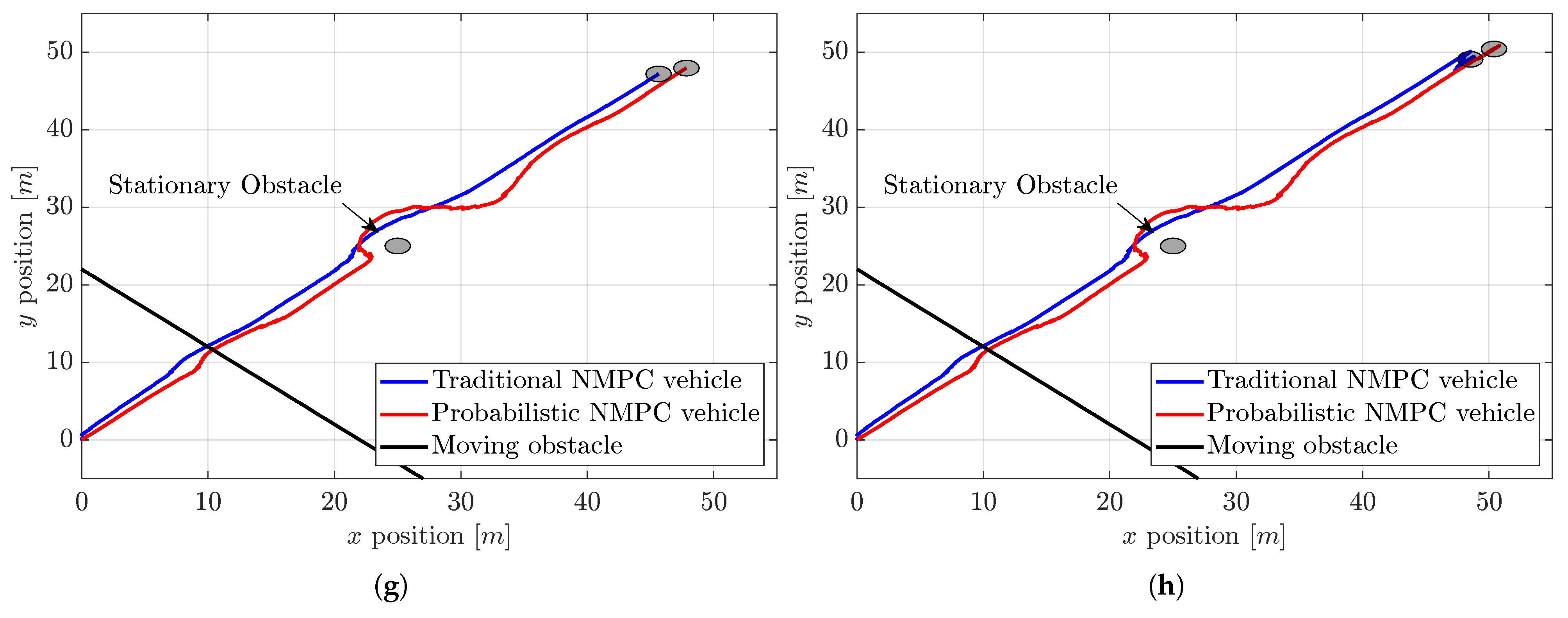 Figure 4, in view of negative values of the disturbance, the traditional NMPC vehicle tracks the reference path slightly to the left and behind the vehicle managed by the probabilistic NMPC. Both vehicles encounter the moving obstacle between 11 and 12 s, navigating past this obstacle quite closely, as the collision gain for this situation is small. Nonetheless, when both vehicles confront the stationary obstacle around 26 to 27 s, they diverge more to avoid it due to the increased collision gain associated with this obstacle. During this avoidance maneuver, the vehicle operated by traditional NMPC does not have to change its position much, as it is already situated to the left of the desired trajectory. But the probabilistic one needs more maneuvering because it is situated almost on the trajectory. And then, both vehicles arrive at their final position around the coordinates (50 m, 50 m).