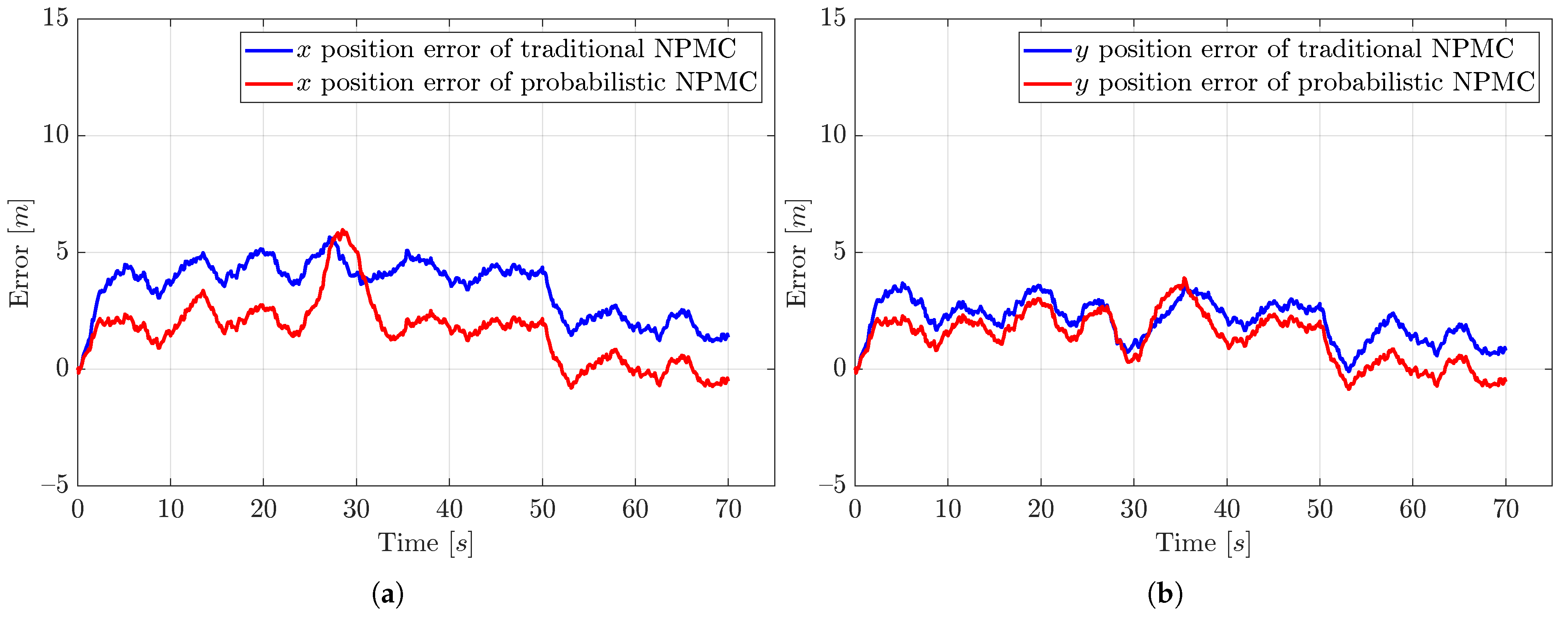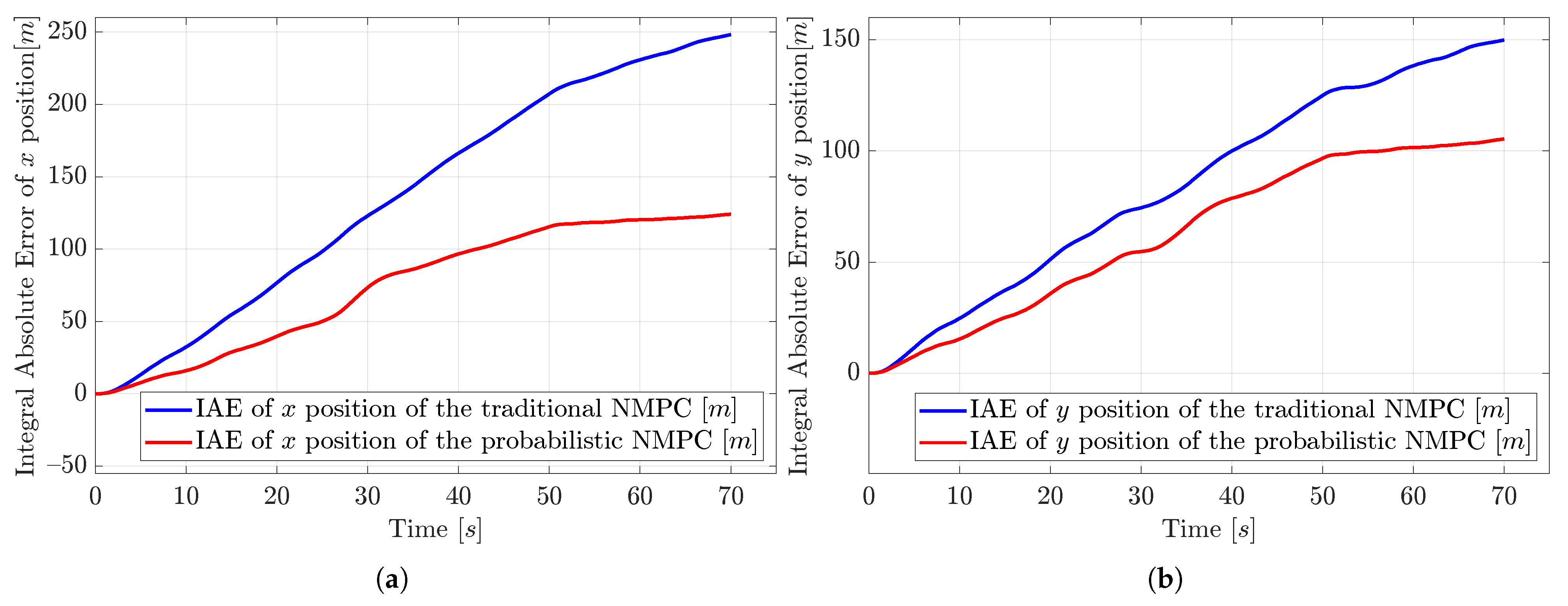So, the probabilistic NMPC controls the system with smaller integral absolute errors (IAEs) than the traditional NMPC. For x, in 70 s, the probabilistic NMPC creates a 124.115 m IAE, but the traditional NMPC creates a 248.284 m IAE, so the traditional NMPC has approximately 100% m more IAE. For y, in 70 s, the probabilistic NMPC creates a 105.418 m IAE, but the traditional NMPC creates a 149.93 m IAE, so the traditional NMPC has approximately 42.22% m more IAE.