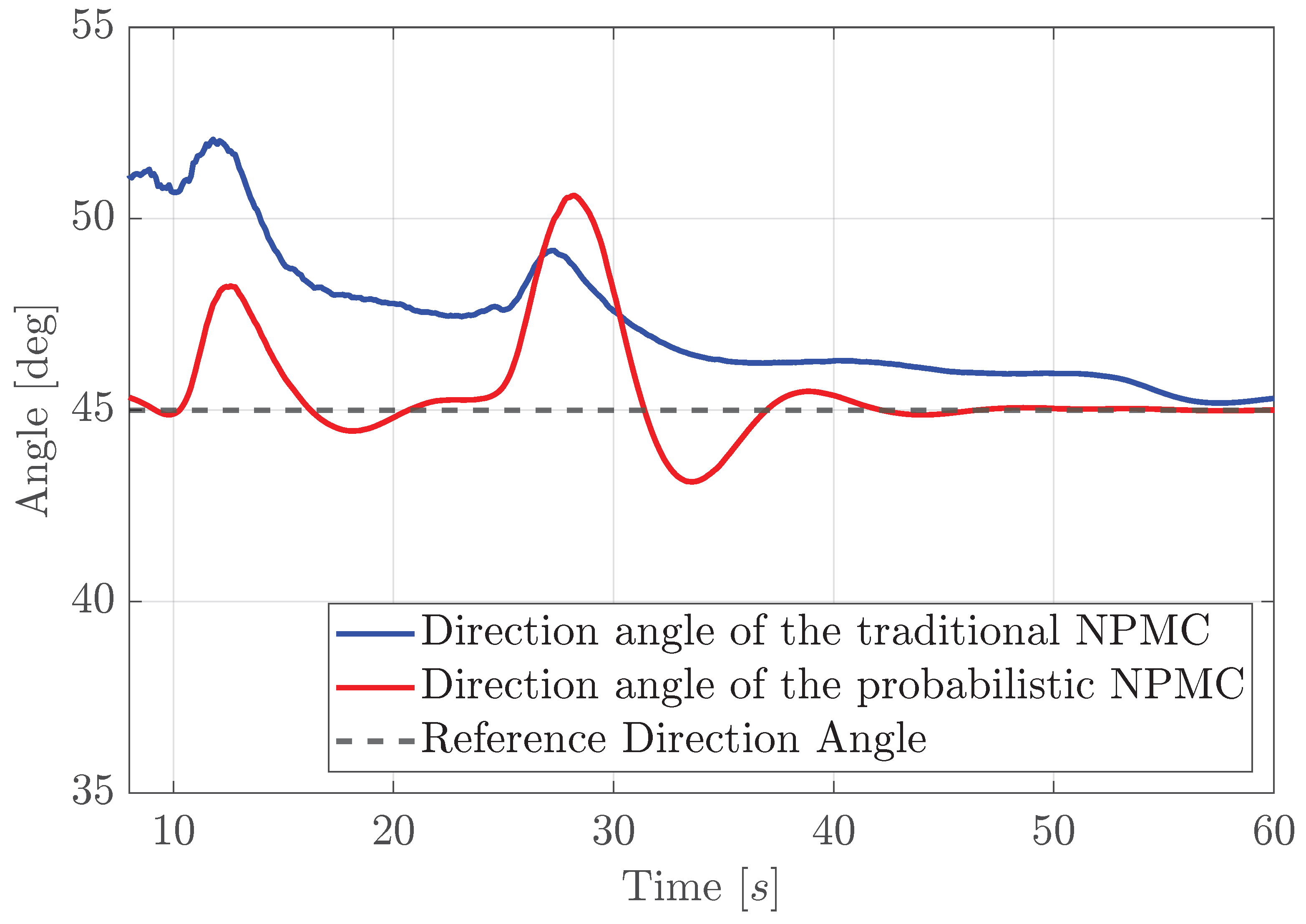 Figure 11 shows the direction angles of both traditional and probabilistic NMPC when they are avoiding obstacles and reaching the target point. One can see that the probabilistic NMPC tracks the 45° angle quite reasonably while avoiding the obstacles approximately at 11 and 26 s, but the traditional one struggles due to the water current.