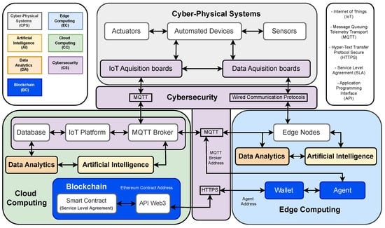 Proposed open-source smart factory architecture integrating seven elements: cyber–physical systems (CPSs), edge computing (EC), artificial intelligence (AI), cloud computing (CC), data analytics (DA), cybersecurity (CS), and a blockchain (BC). The colored regions highlight each component, and the rows represent how they interconnect through different communication protocols.