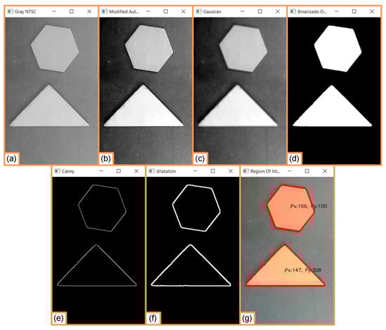 Vision system preprocessing pipeline for robust piece detection: (a) grayscale NTSC conversion; (b) auto-contrast normalize brightness; (c) Gaussian filter to reduce image noise; (d) Otsu binary threshold to separate the piece from the background; (e) canny edge detection to extract object boundaries; (f) edge dilatation to reinforce weak or discontinuous edges; (g) contour highlight in the region of interest.