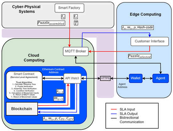 Nowadays, a diversity of SF architectures has been studied in an attempt to explain how emerging and trending Industry 4.0 technologies can be integrated into SF architectures [43]. An example is the open-source SF architecture presented by Fortoul-Diaz et al. [44], composed of technological trends (CPS, EC, AI, CC, DA, and CS) integrated to demonstrate tangram assembly puzzles; these kinds of architectures are compatible with industry tools for transitioning conventional facilities into digitized facilities [43,45]. A pending challenge is estimating the level of trust between the customer and the factory to produce a good. To overcome this challenge, an SLA based on BC as a tool to measure trust is proposed, enhancing the SF features (flexibility, adaptability, and digitization) and compatibility together. The proposed solution to this challenge is explained in detail below.