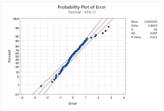 As observed, the fastest time was achieved with the following features: a piece stored at 0 degrees in a warehouse cell (x = 1, y = 2, z = 1) near the distribution station, taking a time of 72.82 s. On the other hand, the typical time was achieved with the following features: a piece stored at 45 degrees in an intermediate warehouse cell (x = 2, y = 1, z = 1), taking a time of 93.48 s. The slowest time was achieved with the following features: a piece stored at 0 degrees in a warehouse cell (x = 4, y = 2, z = 2) far from the distribution station, taking a time of 105.01 s. Finally, the last column represents the error between the estimated and the measured time in seconds and percentages. To validate the suitability of the mixed-effects model for SLA configuration, the prediction errors between the estimated assembly time () and the measured time () were analyzed across the 90 experimental scenarios, and their distribution was evaluated using a normal probability plot with 95% confidence, shown in Figure 7; the p-value obtained is 0.022, and it is smaller than 0.05, indicating that the mixed effect model for the estimated time () is adequate to be implemented within the SLA for the Trust measurement. Additionally, the point values are within the limits of the normal distribution, following a positive correlation of the data.