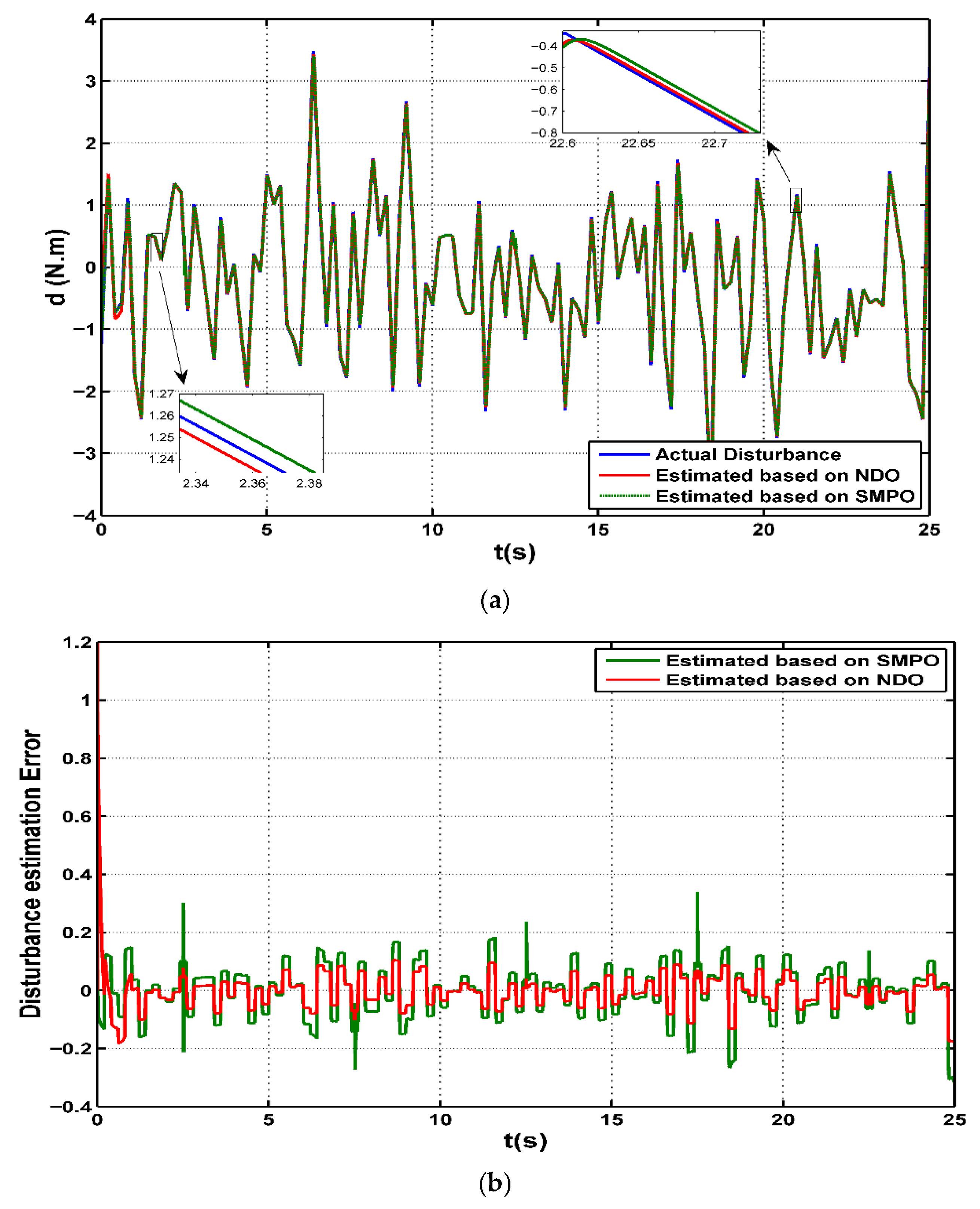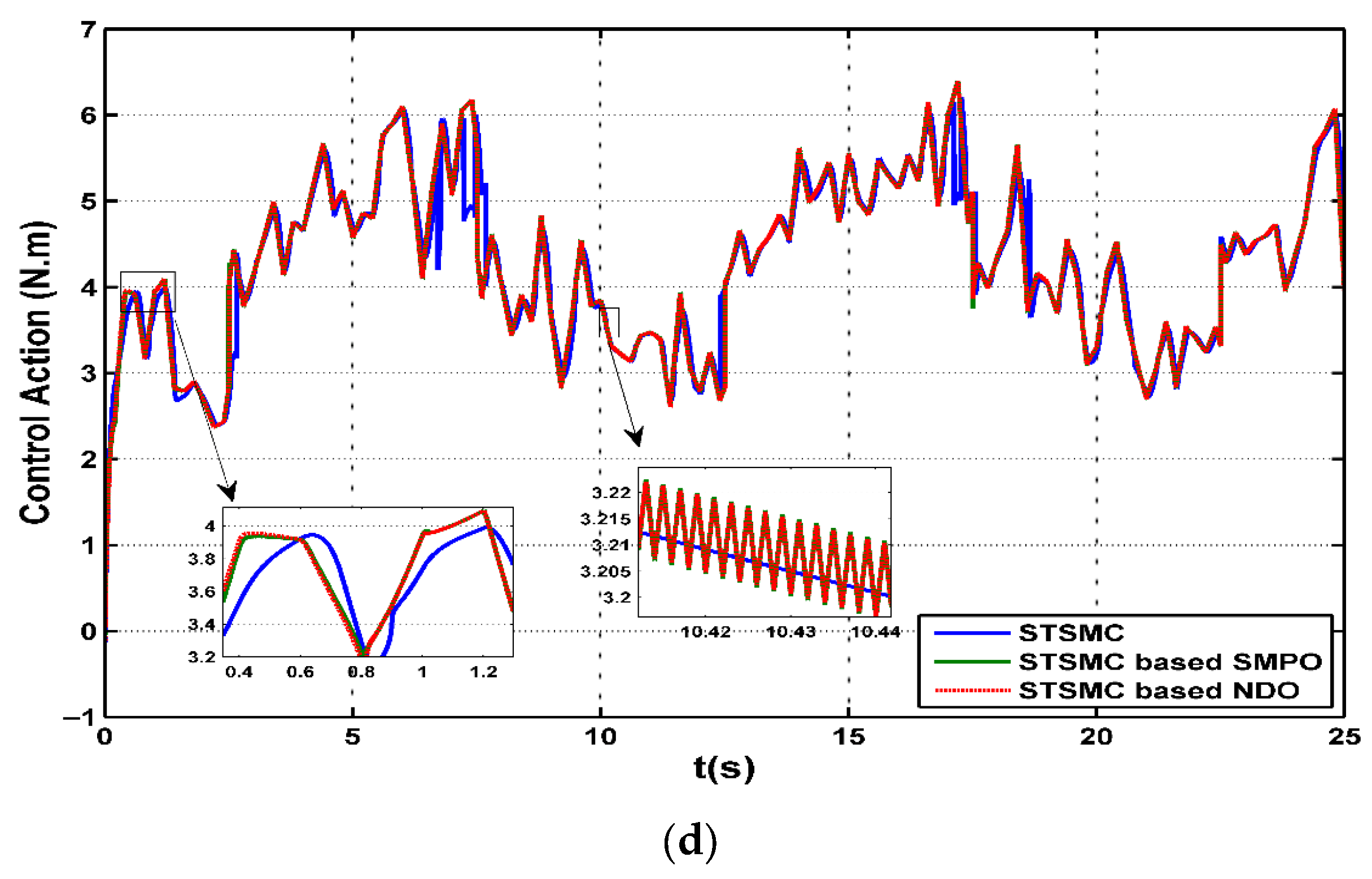 - Comparative analysis of the NDO-based STSMC and the SMPO-based STSMC algorithms is carried out under unified conditions, including external disturbance, to reveal the differences in robustness and control effort.