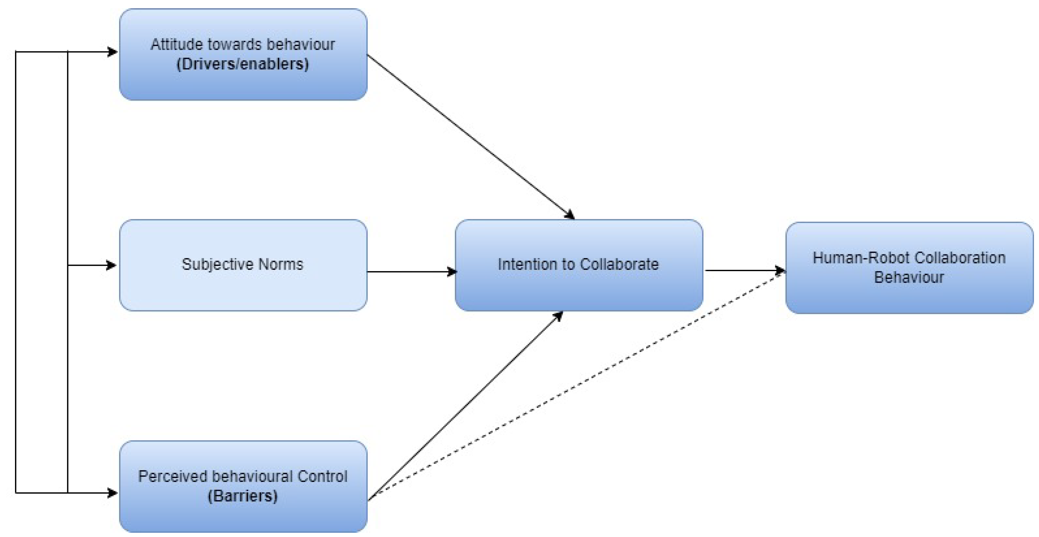 Similarly, perceived behavioural control is conceptualised in this study as a representation of structural and systemic barriers that constrain the ability of individuals and organisations to engage in effective human–robot collaboration [