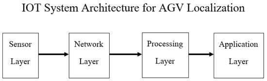 The conceptual framework for the IoT system architecture for AGV localization (Figure 3) is designed to collect, synchronize, and integrate data between multiple sensors and a central processing unit. This architecture consists of four main layers: