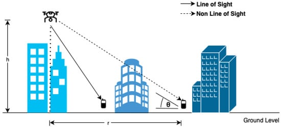 - Environment and propagation modes.Following [45,46], the UAV base station (UAV-BS) is modeled as a low-altitude platform (LAP) operating in a 3GPP urban macro (UMa) environment. Radio propagation alternates probabilistically between LoS and NLoS conditions depending primarily on the elevation angle between the UAV and the given user equipment (UE).Considering 3GPP UMa environment it is extremely necessary and common practice to consider all required parameters to calculate pathloss in LoS and NLoS scenarios as shown in Figure 1 which would eventually be needed to calculate channel gains of users in different subchannels and throughput.