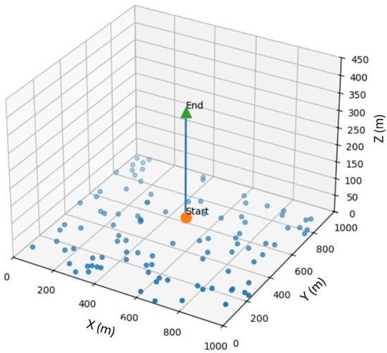 - Receiver noise and SIC residuals. Per-subchannel noise (thermal plus receiver figure) iswith dB. UL–NOMA decodes in ascending received power or under an adaptive rule; the interference for user n on subchannel s iswhere denotes the decoding order, is the scheduled set on s, and models imperfect SIC with residual factor . The elevation driven behavior is set up in a scenario where the UAV flies straight up in a uniformly distributed user distribution scenario as shown in Figure 2 and its impact on pathloss as well as probability of LoS are depicted in Figure 3 and Figure 4 respectively.