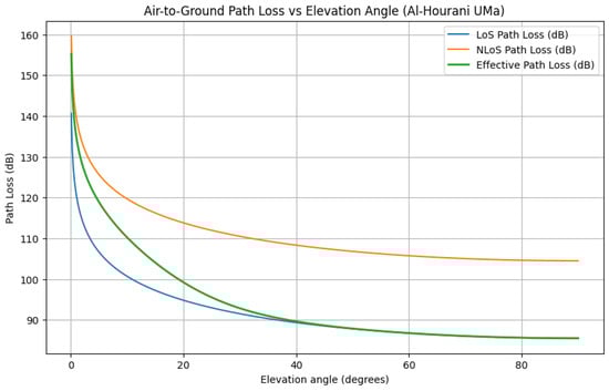 Figure 3. Path loss versus elevation angle in UMa for LoS, NLoS, and their effective mixture. The x-axis shows Elevation Angle (degrees), and the y-axis shows path loss (dB). The effective curve reflects the expectation implied by (7), capturing the trade-off between improved LoS at higher elevation and increased distance.