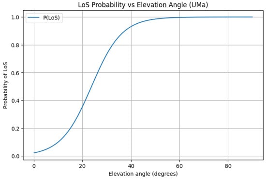 Figure 4. LoS probability versus elevation angle under the Al-Hourani model. The sigmoid transition (notably around –) highlights rapid gains in LoS as the UAV moves toward overhead, guiding vertical and lateral placement for coverage.