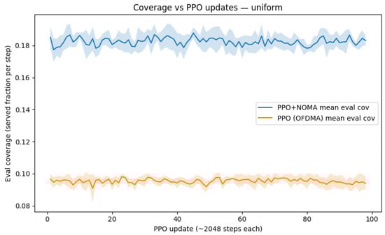 Finally, ref. [20] studies joint resource allocation and UAV trajectory optimization in downlink UAV-NOMA networks with QoS guarantees using a heuristic matching-and-swapping scheduler and convex optimization. We consider the complementary uplink case in disaster response, replacing heuristic matching with an RL-driven policy (bounded-action PPO–GAE) that adapts online across varied user spatial distributions.