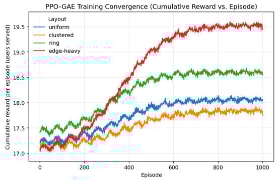 - Training hyperparameters.To ensure stable learning and reproducibility across layouts, we adopt a conservative PPO–GAE configuration drawn from widely used defaults and tuned with small grid sweeps around clipping, entropy, and rollout length. Unless otherwise stated, all values in Table 2 are fixed across experiments, with linear learning-rate decay and early stopping to avoid overfitting to any one topology.