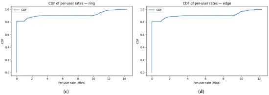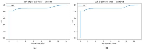 - User field (spatial layout).Users are uniformly instantiated within a area (i.e., ). Alternative layouts (e.g., clustered, ring, and edge-heavy) can be sampled for robustness; the initialization here defines the default field for the baseline experiments.