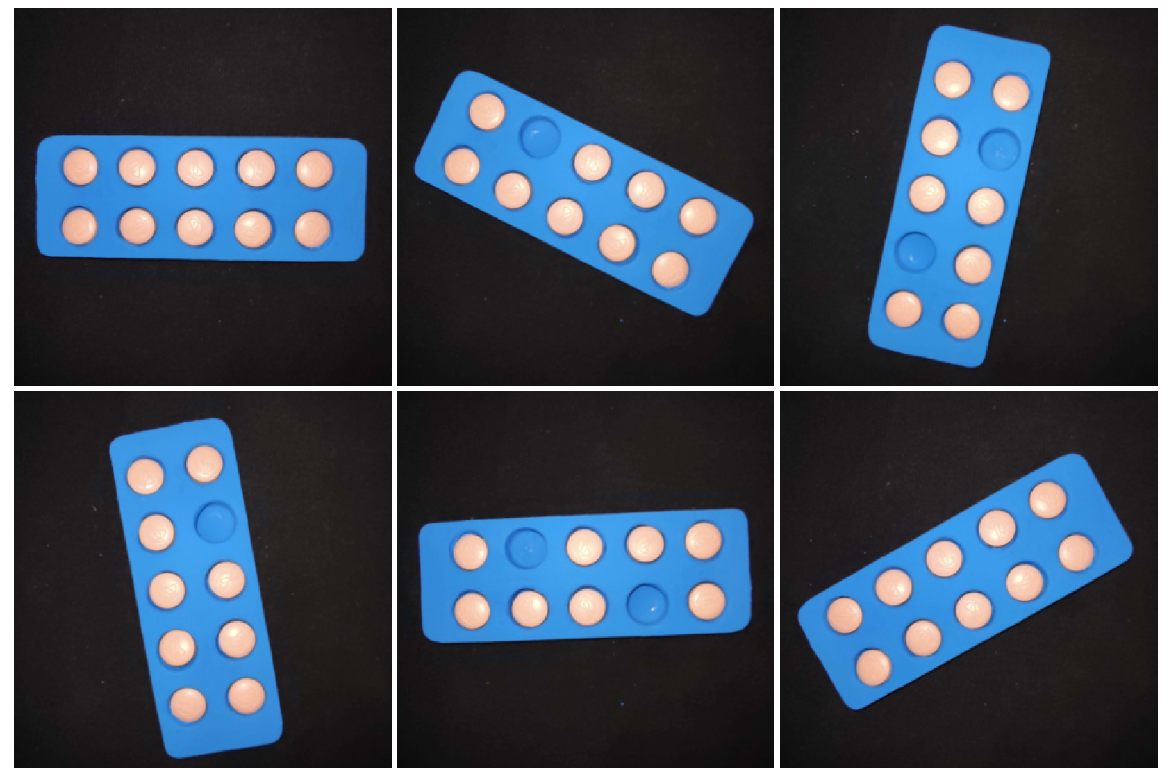 To implement it, it was first necessary to obtain images for classifier training. A blister of 10 circular pills was used. The blister is blue, while the pills are a light pink color. Images were taken with a cell phone, with a zenith angle, at a distance of 20 cm from the blister on a black background, with a resolution of 300p × 300p. 78 images were made, in which the horizontal orientation of the blister was varied (
