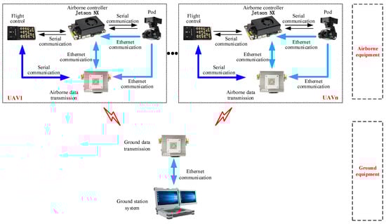The main function of the UAV airborne controller is to run the keyframe extraction algorithm, convert the video stream from the pod into keyframes, and transmit them back to the ground station system via the data link. The ground station system runs the ground visual mosaicking software (Version 1.1.0), which performs image stitching on the keyframes returned by each UAV to generate a panoramic image. All devices communicate with each other through serial communication or Ethernet communication. The data communication relationships between devices are shown in Figure 5.
