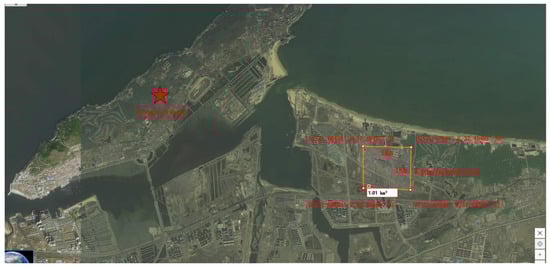 The experimental area is located in the 1 km × 1 km area ABCD formed by the four coordinate points A, B, C and D on the east side of Yangma Island in Muping District, Yantai City. The length in the east–west direction is 1 km, and the length in the north-south direction is 1 km. As shown in Figure 7, the coordinates of the four points are: