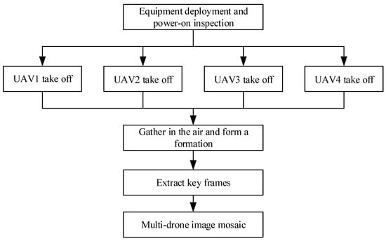 The specific experimental process is divided into the following steps: equipment deployment, power-on self-test → UAVs take off in turn → formation → cover the task area for flight → key frame extraction → image mosaic. The experimental process is shown in Figure 9.