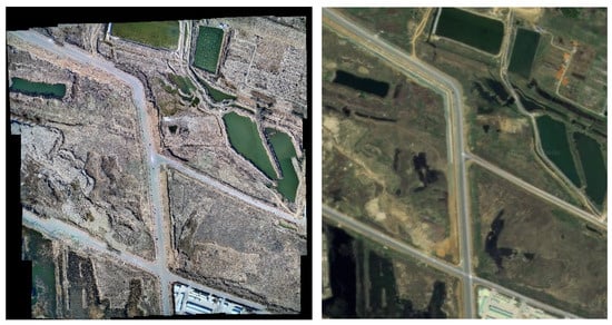 After the area is covered by the flight, the comparison between the panoramic mosaic map obtained by the multi-UAV image mosaic software and the Baidu map of the same area is shown in Figure 11.