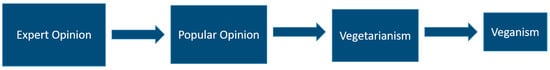 Other surveys, as displayed by Wikipedia [], indicate that around 10% of the population in Western countries follows a vegetarian diet, and much less, perhaps two or three per cent, a vegan diet. This combination of facts leads to the proposed wave of post-lethal agriculture as depicted in Figure 1. The expert opinion does not fully translate to the popular opinion, but the development on the expert side leaves its traces in the general discourse. Likewise, the growing opposition against the killing of farm animals slowly and partially translates into the personal consequence of stopping meat consumption. Yet, only a tiny minority has taken the last step of forgoing the consumption of eggs and milk.