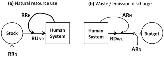 (a) Natural resource usage and its interaction with regeneration rates and stock; (b) Emission/waste discharge and its interaction with assimilation rates and budget.