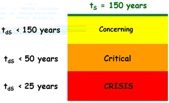 Depletion times are a more intuitive and effective means of communicating to people whether or not natural resource utilisation or waste/emission discharge is environmentally unsustainable. Depletion times can act as early warning signals of environmental unsustainability of particular key resources and emissions. Figure 2 illustrates this by the application of a yellow/orange/red warning signal of the state of environmental unsustainability of a natural resource stock or waste/emission budget. In this example, the sustainable time-frame is given a value of 150 years. It is considered “Concerning” when the depletion time moves below 150 years, “Critical” when it moves below 50 years, and “CRISIS” when it moves below 25 years. The time values and words presented in Figure 2 are subjective and are given to highlight that lower depletion times are of greater worry and require more urgent action. Furthermore, the time values may vary between natural resources depending on their perceived criticality and substitutability. Likewise, they may also vary between wastes/emissions depending on their perceived harmfulness and importance of benefits associated with the goods/services that give rise to the wastes/emissions.