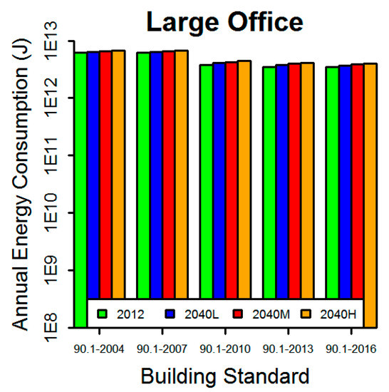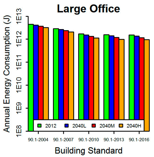 Building energy consumption was simulated for stock building models using actual 2012 observed weather data and three 2040 projected climate scenarios weather files using EnergyPlus [40]. The cooling and heating loads, as well as electricity and natural gas consumption, were taken from the energy model simulation output for five commercial building types (large office, small office, primary school, full-service restaurant, and high-rise multi-family apartment buildings) as built to five different energy standards (ASHRAE 90.1-2004, 90.1-2007, 90.1-2010, 90.1-2013 and 90.1-2016).