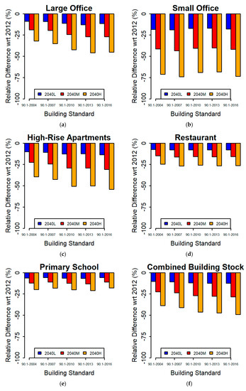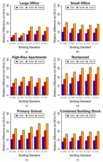 The annual heating natural gas consumption and relative differences, with respect to 2012, for the three meteorological scenarios for the study building types and standards are shown in Figure 2, Appendix B, and Figure 3. The modeled 2040 meteorological scenarios result in lower natural gas consumption for all building types and standard combinations, due to the lower demand for heating. The office building type shows the two largest relative decreases in 2040 heating energy with respect to the 2012 baseline, with large offices (Figure 3a) and small offices (Figure 3b) reaching reductions of up to 30% and 75%, respectively. The high-rise apartment, restaurant, and primary school building types (Figure 3c–e) showed relatively minor differences in natural gas consumption between the building standards. High-rise apartment buildings (Figure 3c) show consistently smaller relative gas consumption reductions across the building standards; however, as their share of the built area is expected to be approximately a quarter of that taken up by the commercial sector, these reductions are not negligible. Restaurants (Figure 3d) showed a nearly constant pattern of gas consumption reduction across building standards. It must be noted that only approximately 40% of natural gas consumed by restaurants is used for heating, while the majority is used for other purposes, primarily cooking, which will not be directly affected by the meteorology. Throughout all cases, more modern building standards result in lower absolute natural gas consumption regardless of the scenario (Figure 2, Appendix B). While the small office and primary school building types (Figure 3b,e) show the largest percentage reductions, from 2012 baseline levels, for the 90.1-2010 Standard, the newer Standards (90.1-2013 and 90.1-2016) still result in lower absolute natural gas consumption. The energy demand of the combined building stock (composed of these five building types which are expected to represent nearly 55% of the commercial building stock by 2040) is reflective of the two largest contributors: high-rise apartments and large offices (Figure 3f).