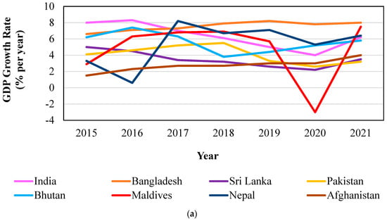 (a) Nominal GDP growth rate (% per year) from 2015–2021 [51]. (b) Real GDP growth rate (% change per year) from 2015–2024 [52].