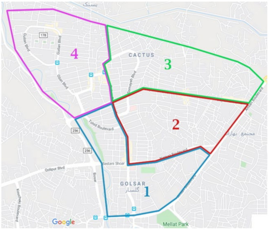 The selected case is Golsar town in Rasht, geographically located in the North of Iran, with an urban population of 748,711 in 2016 and with an area of 180 km2. This town with around 115,000 population is one of the high-density residential areas in the city and can be considered as an upscale neighborhood (Figure 1). Based on the information of the municipality, four districts of Golsar were chosen to focus on neighborhood walkability and street connectivity (Figure 2). The research paper identified useful understandings of the positive and negative effects of street design in Golsar that are one of the main options of citizens of Rasht to buy or rent houses and apartments despite the high price of estates.