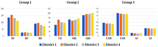 First, the definition of variables was explained in the Section 3. In this part, for the assessment of street connectivity, values of 10 variables for each district in Golsar town should be calculated by using GIS data. The information concerning the 10 variables was extracted via GIS software (ArcView) in each district (Table 1). In addition, the measures of variables are shown in Figure 3 in three groups of bar charts. Group 1 includes intersection (ID), street density (SD), and block density (BD). Group 2 consists of cul-de-sac density (CD), average block length (ABL), and average block section (ABS) in which a small number means a better one. Group 3 includes connected node ratio (CNR), link node ratio (LNR), alpha index (AI), and gamma indexes (GI). As shown, District 1 ranked the first in six variables, including cul-de-sac density, average block section, connected node, and link node ratio, as well as alpha and gamma indexes. It means that regarding these measures, the total measure of connectivity of streets in District 1 is better than others. However, District 2 possessed better connectivity according to these four variables: intersection, street, and block density, as well as average block length. District 4 had the worst condition in six variables in comparison with other districts. Additionally, District 3 had a similar condition with a minimum amount in the last three variables: link node ratio, alpha, and gamma indexes.
