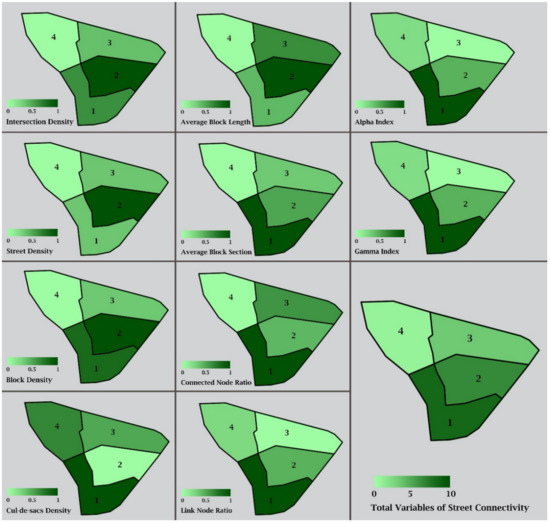The choropleth maps in Figure 4 show the results of normalized variations of the above table for each variable and total amount in four districts of Golsar town. A choropleth map is a type of thematic map used for visualizing the values of a parameter over a geographical area through the color spectrum. In this figure, colors changed from light to dark green (from 0 to 1) to represent the changing of the values of the variables of street connectivity in Golsar. Darker green displays a better normalized value and lighter green displays a worse one. The variation of the total values from 0 to 10 can be seen in the largest frame. District 1 has the first rank in six variables including cul-de-sac density, average block section, connected node ratio, link node ratio, alpha index, and gamma index. However, District 2 has the most value in the remaining variables. Except for cul-de-sac density, which in District 2 has the lowest value among all districts, District 3 or 4 possesses the last rank in the other nine parameters of street connectivity.