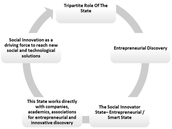 The interpretation of the exploratory investigation and the relevance and “place” that it is intended to give to social innovation within the state suggests the relevance of a hypothesis of social innovation as a possible driving force of an Entrepreneurial and Smart State [44] and vice-versa (Figure 1). Thus, it can and should be a driving force in the emergence of an Entrepreneurial and Smart state, as well as the state should play a fundamental role in the dissemination and support of social innovation projects that will lead to economic, social and technological growth. The diagram below shows the perspective and direction in which this article intends to direct future research. As suggested throughout the text the classic and old-fashioned view of the state must be open to entrepreneurial discovery [60], culminating in a new type of approach, working directly on social and economic well-being from risk-taking and innovative perspectives, where social innovation can play a prominent role. We suggest the possibility of a “Social Innovator State”.