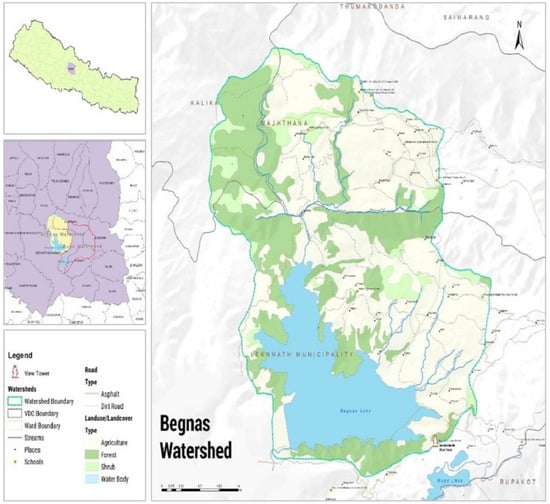 This study was carried out in Begnas Lake watershed at Pokhara-Lekhnath Metropolitan of Kaski district of Nepal (Figure 1). Begnas Lake is a freshwater lake extending between 28° 7′ N to 28°12′ N latitudes, and 84°5′ E to 84°10′ E longitudes ranging from the elevation ranges from 600 m above sea level in the south to 1440 m to the north. Begnas lake watershed area comprises the former Begnas village development committee (VDC), Majthana VDC, ward 1–5 of Kalika VDC, and wards 8–11 of former Lekhnath Municipality. After the government’s recent reclassification of local administrative units, most parts of the watershed area lie in wards 28, 30, and 31 of the Pokhara-Lekhnath Municipality. The Begnas Lake watershed includes three distinct landforms: steep to very steep hill slopes to the north, valley to the floor to the south and south-east, and Begnas lake is located at the confluence of these two landforms. The total area of the Begnas lake watershed that feeds water and sediment to the lake is 49 km2, including the area’s socio-cultural and ecological landscape. The wetland has high biodiversity, which provides great aesthetic value and is an important tourist attraction. Locals generate income from ecotourism activities such as boating or other water sports in the lake. This lake is enlisted as a Ramsar site, a wetland of international importance under the Convention on Wetlands. The watershed is under different land use, including forestry, with agriculture being dominant. Furthermore, different areas of land within the watershed are under different management regimes, including private, community, and government ownership. The lake is under growing pressure from increasing populations and their demand for the products and services generated by the wetland and its catchment. The area has gone through a significant population increase where the number of households between 2001 and 2011 increased by 60% [30].